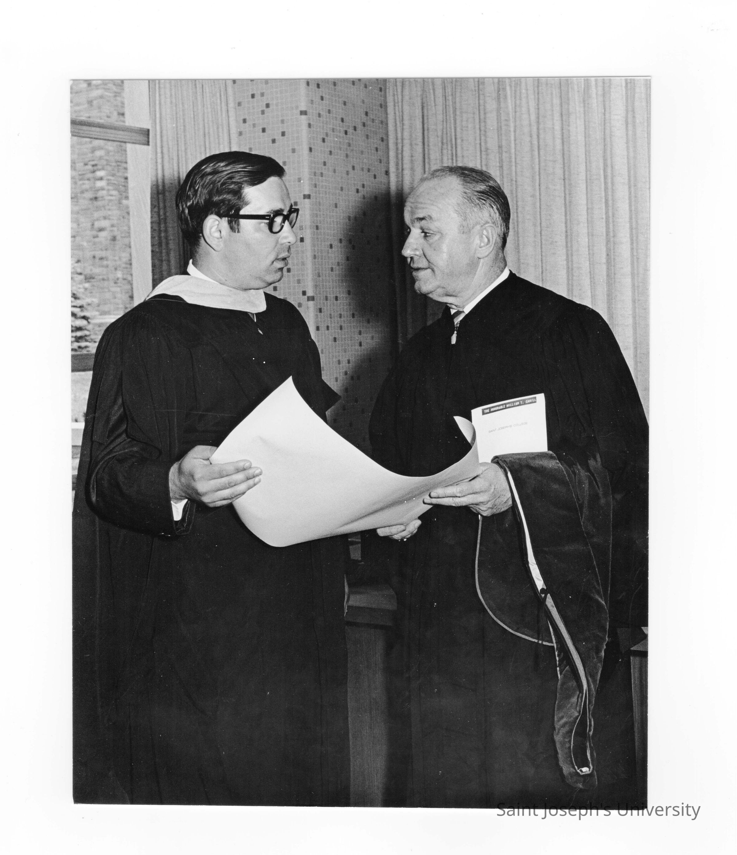 Honorary degree recipient Governor William T. Cahill standing with other individual during 1970 graduation/commencement.