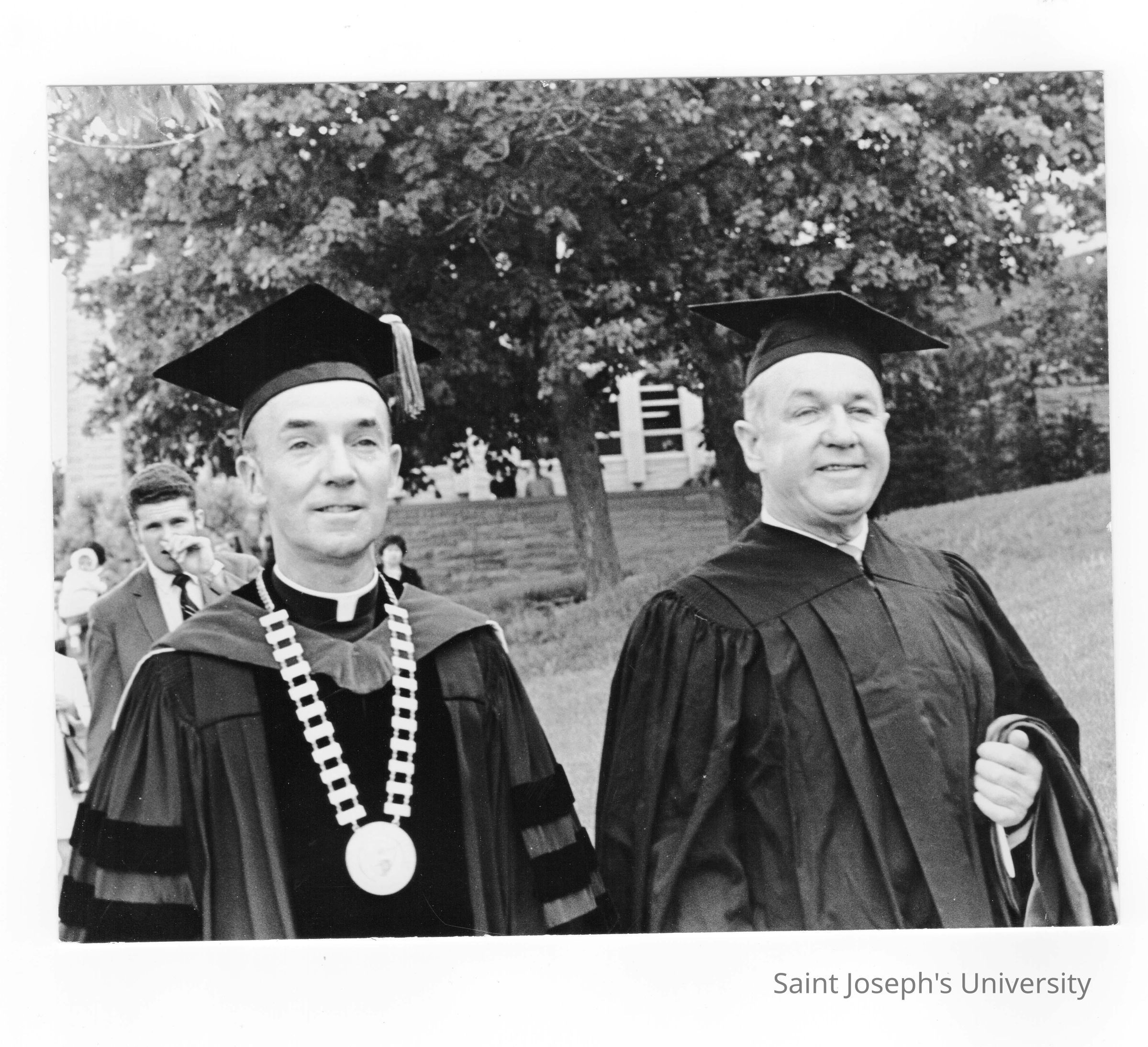 Terrence Toland, S.J., processing with honorary degree recipient, Governor William T. Cahill during 1970 graduation/commencement.