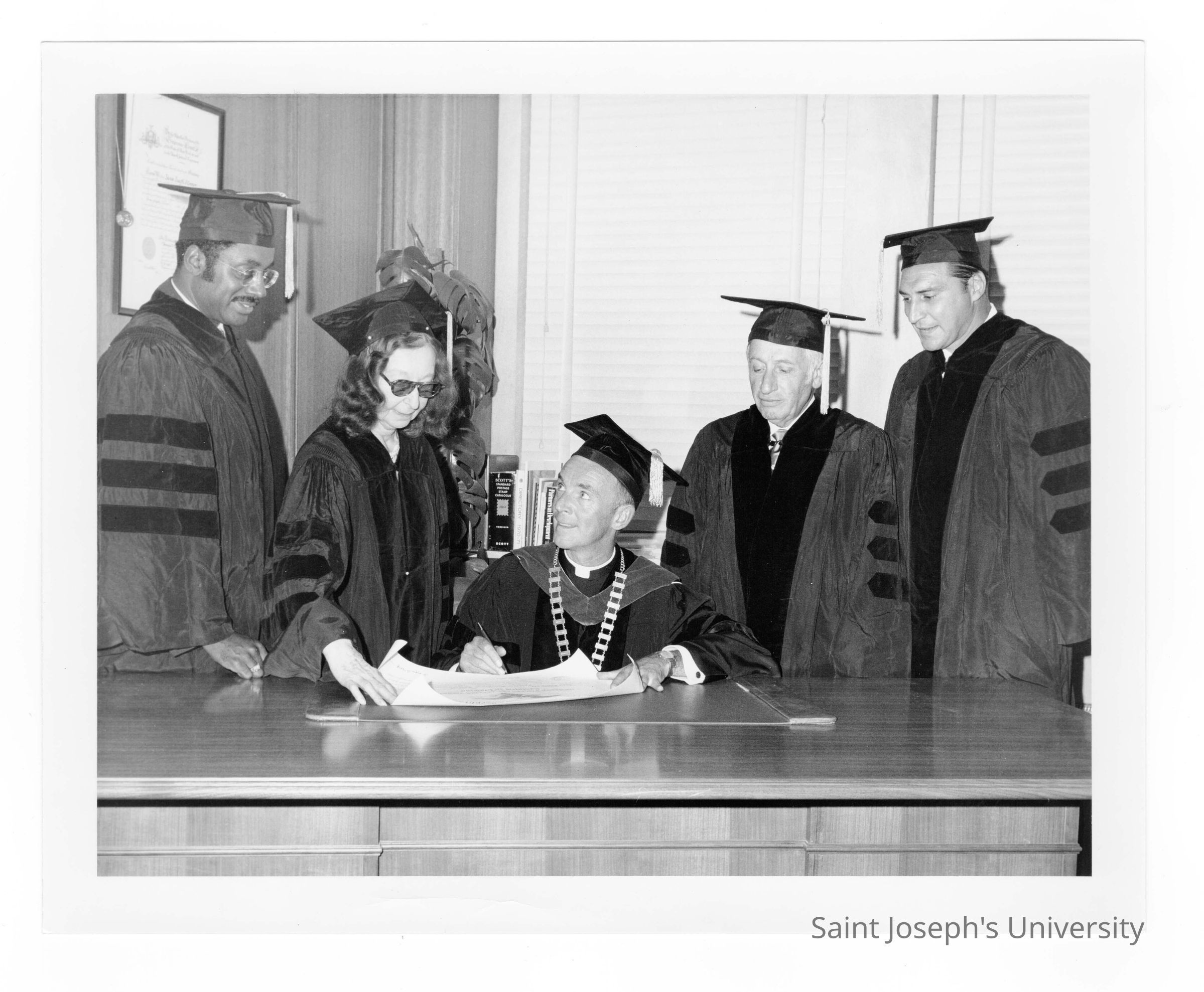 Terrence Toland, S.J., with four honorary degree recipients, Alan D. Ameche, Marcus A. Foster, Max M. Leon, and Violette de Mazia during September 1970 graduation/commencement.