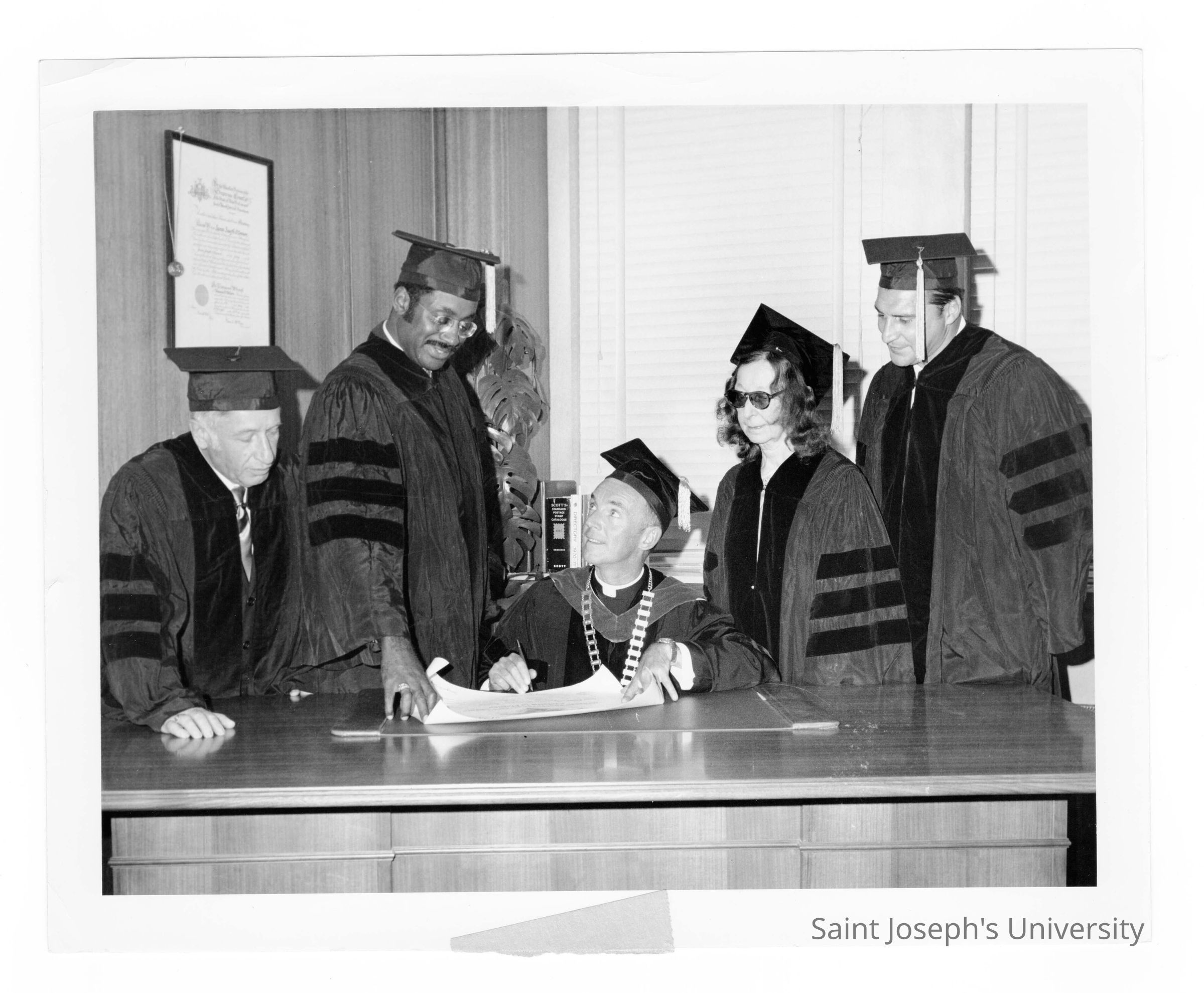 Terrence Toland, S.J., with four honorary degree recipients, Violette de Mazia, Alan D. Ameche, Marcus A. Foster, and Max M. Leon dring September 1970 graduation/commencement.
