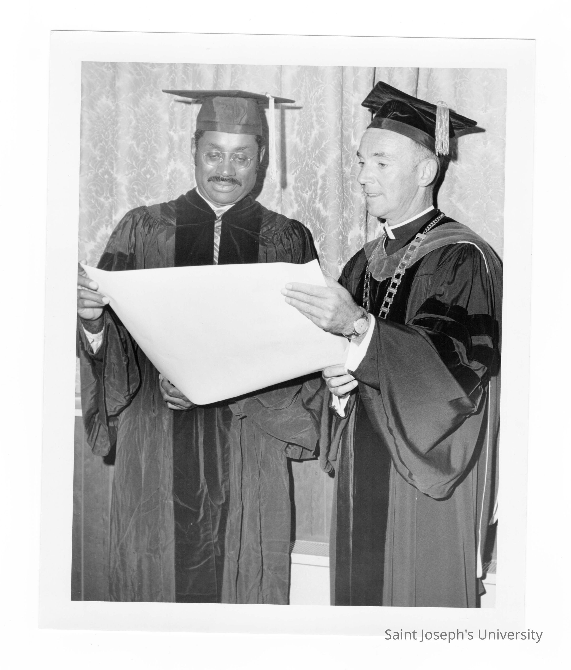 Terrence Toland, S.J., with honorary degree recipient, Marcus A. Foster (?) during September 1970 graduation/commencement.