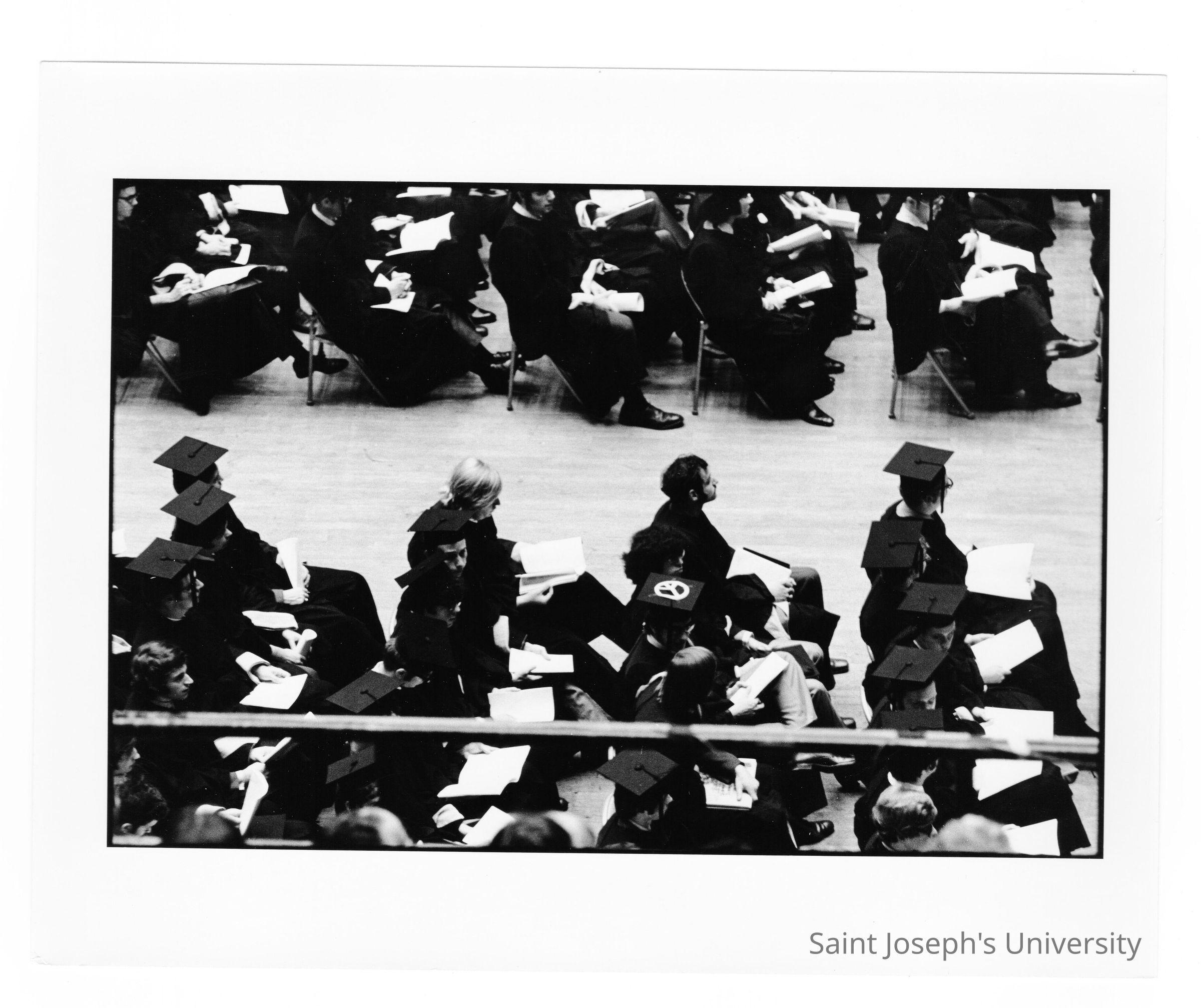 Graduates during 1971 graduation/commencement ceremony with peace symbol on caps.