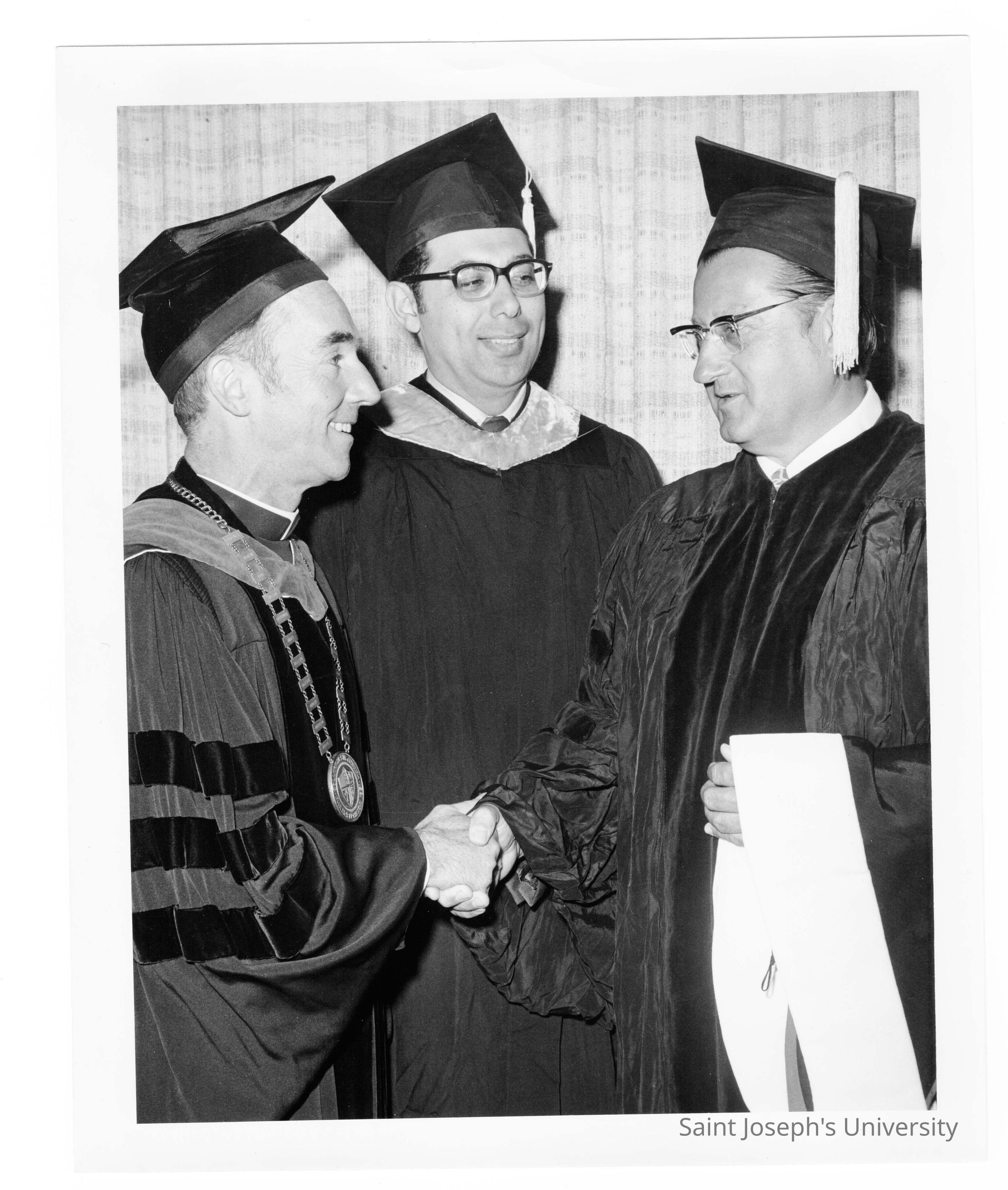 Terrence Toland, S.J., with honorary degree recipients Daniel N. DeLucca (?) and Edward J. Piszek (?) during 1973 graduation/commencement.
