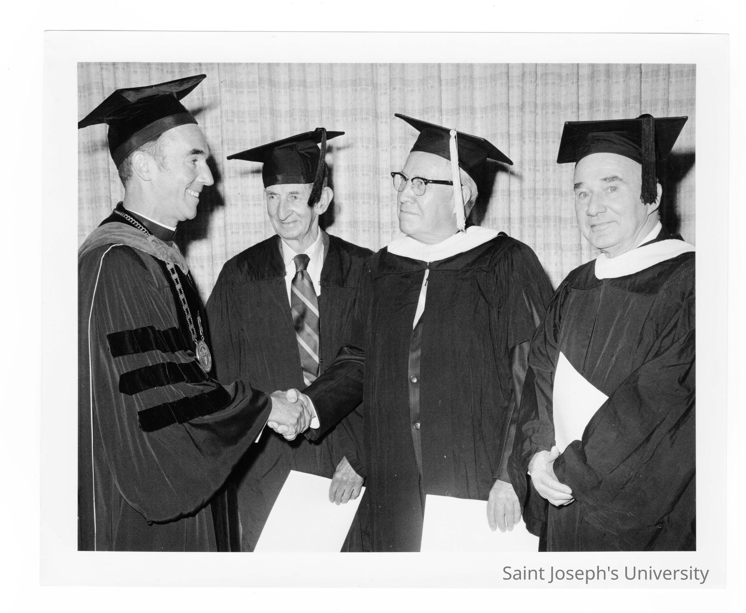 Terrence Toland, S.J., with members of class of 1923 (?, Golden Hawks) or Bene Merenti medalists (?) during 1973 graduation/commencement.
