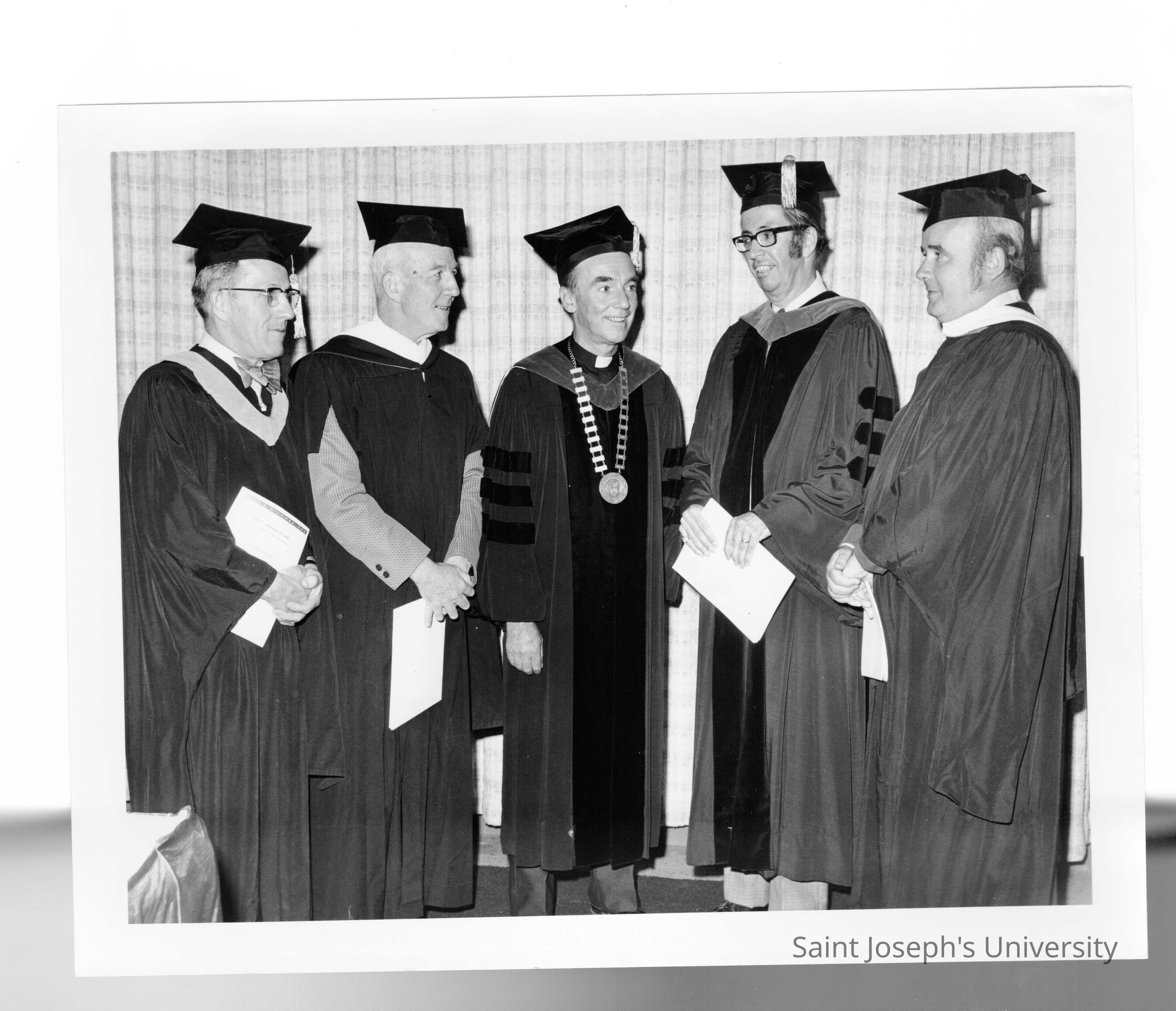 Terrence Toland, S.J., with four recipients of Bene Merenti medal including Edward Sutula, Vincent G. Ryan, Francis R. Olley, John P. Mullen during 1975 graduation/commencement.