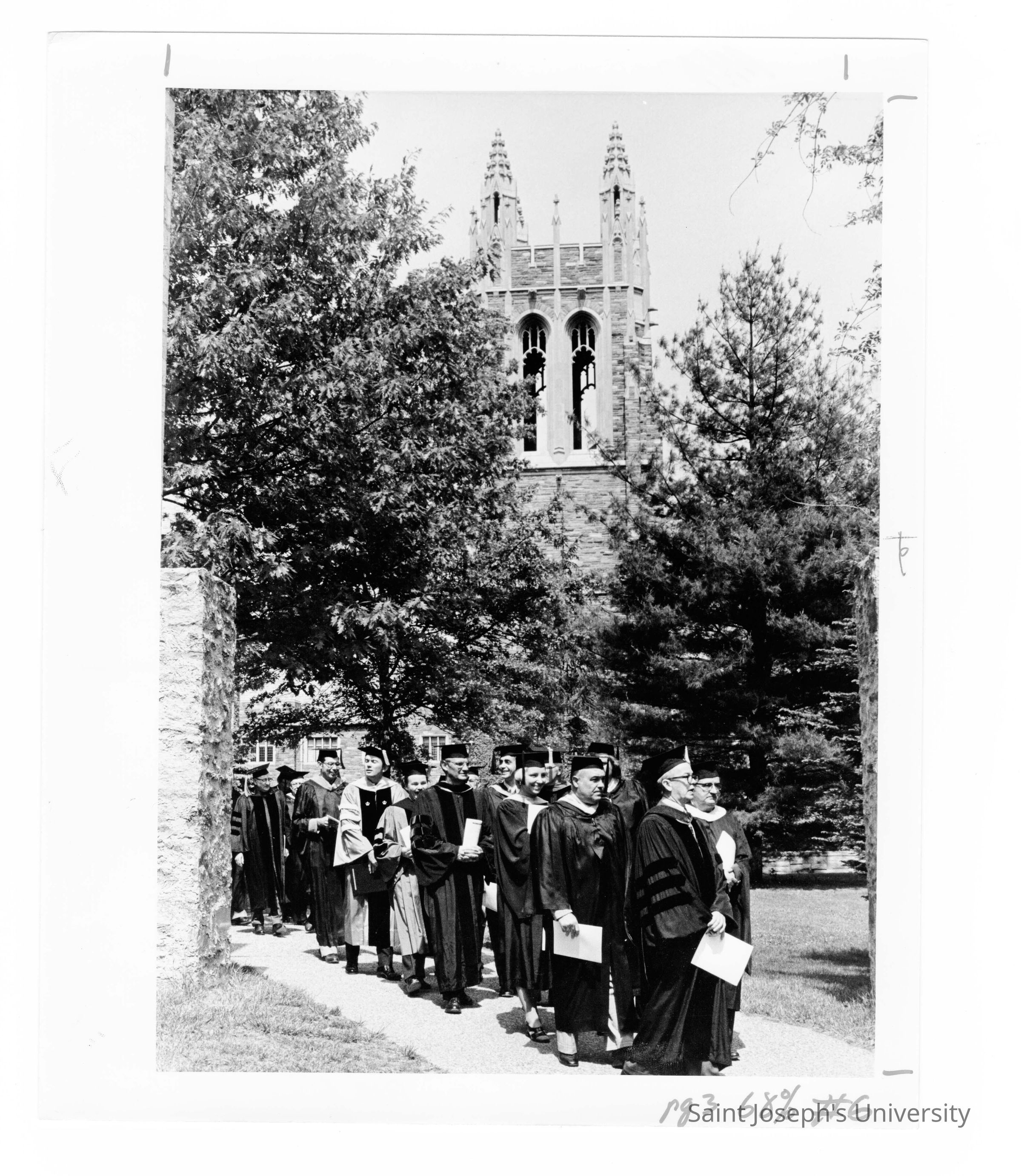 Faculty processing to Gest Lawn during 1976 graduation/commencement ceremony with Barbelin Hall in background.