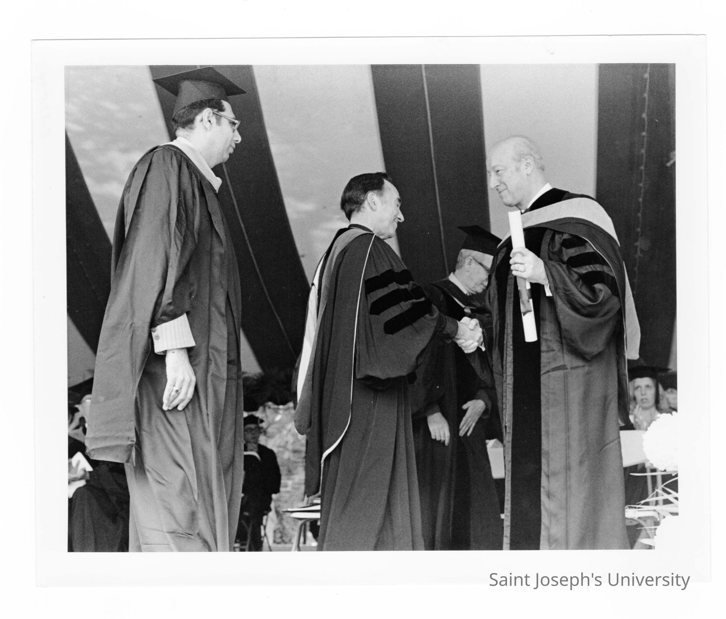 Terrence Toland, S.J. conferring honorary degree on James L. Hayes during 1976 graduation/commencement with Daniel DeLucca looking on.