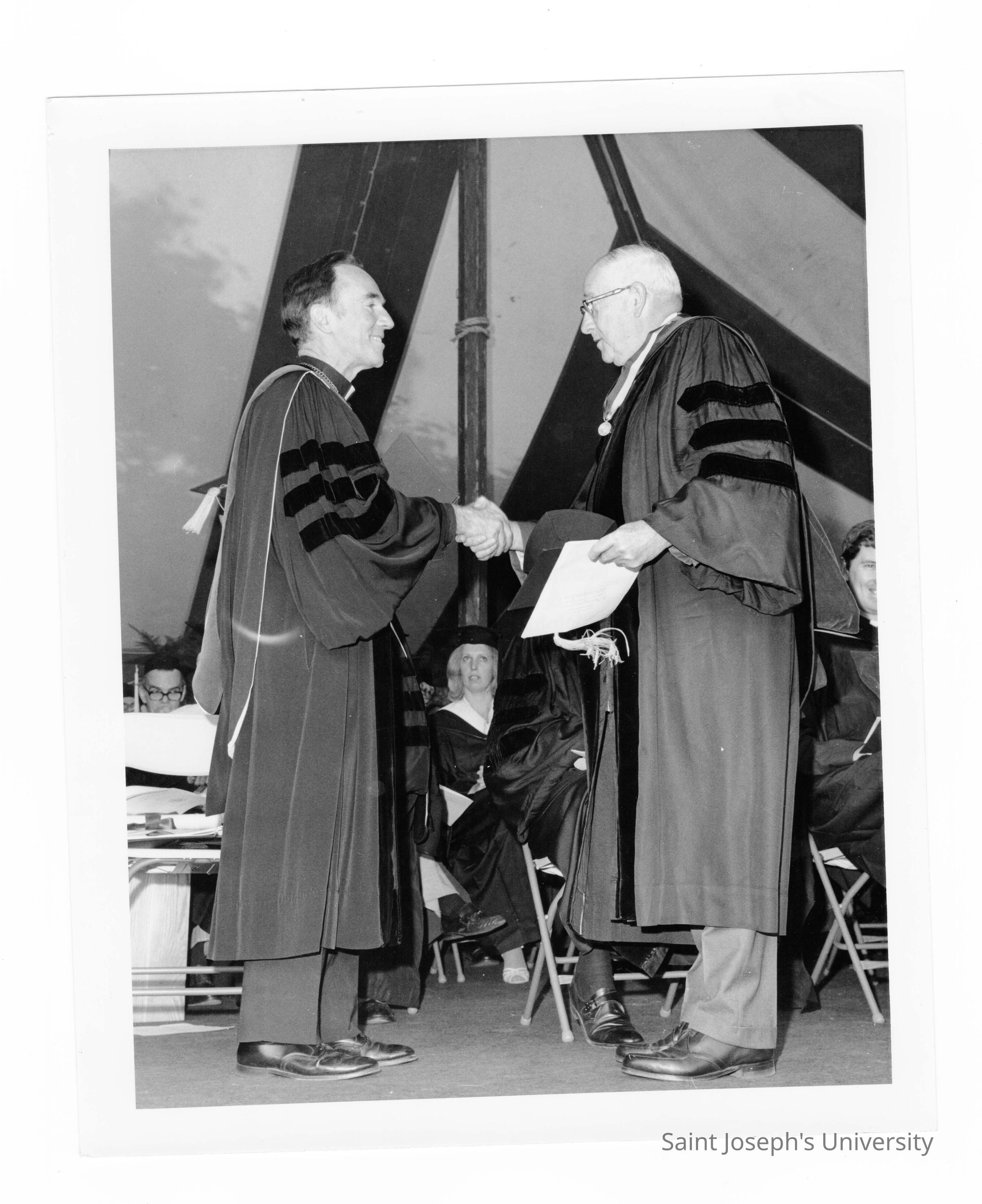 Terrence Toland, S.J., congratulating faculty honoree (?) during 1976 graduation/commencement.
