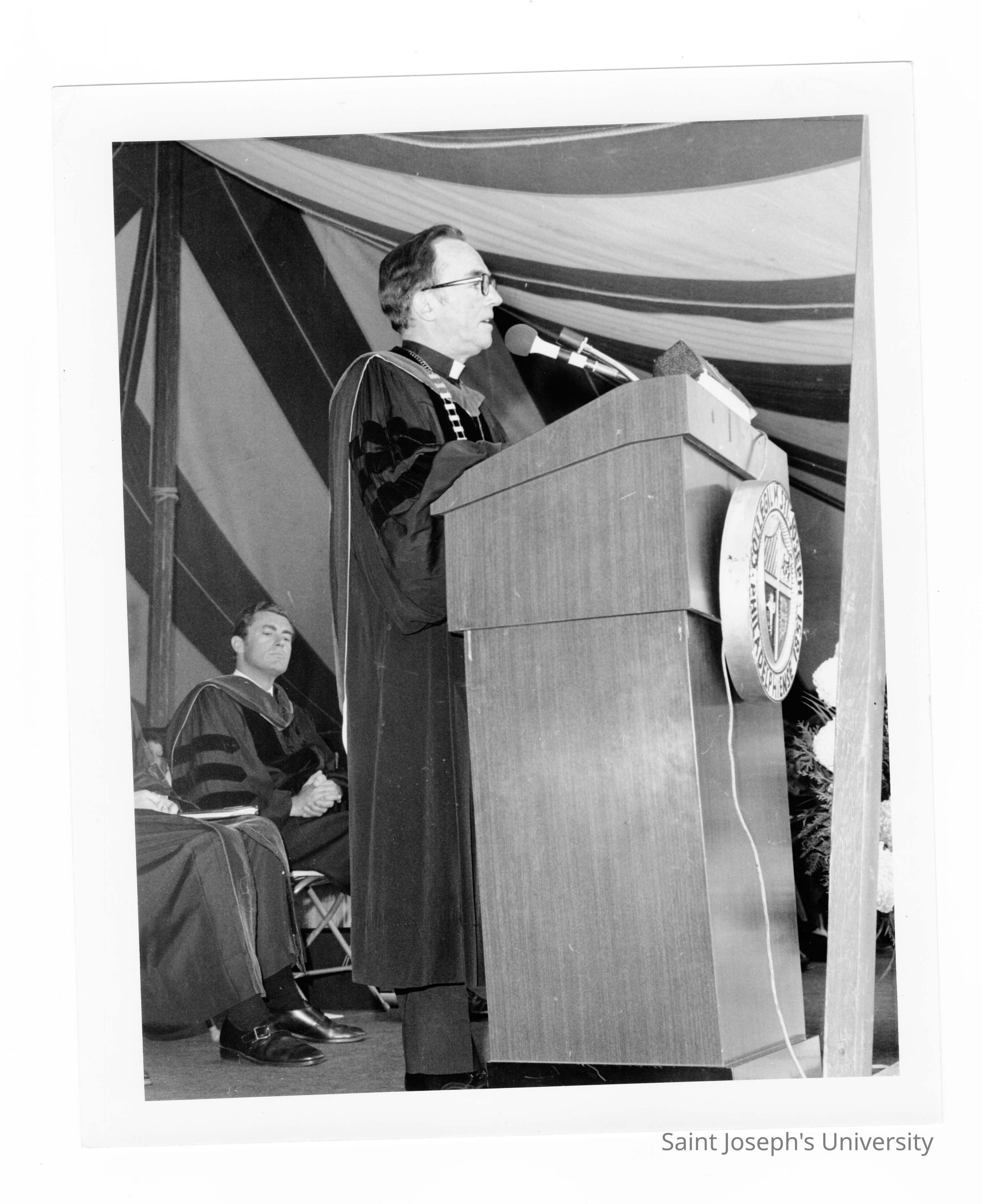 Terrence Toland, S.J., addressing graduates with William J. Green III listening during 1976 graduation/commencement.