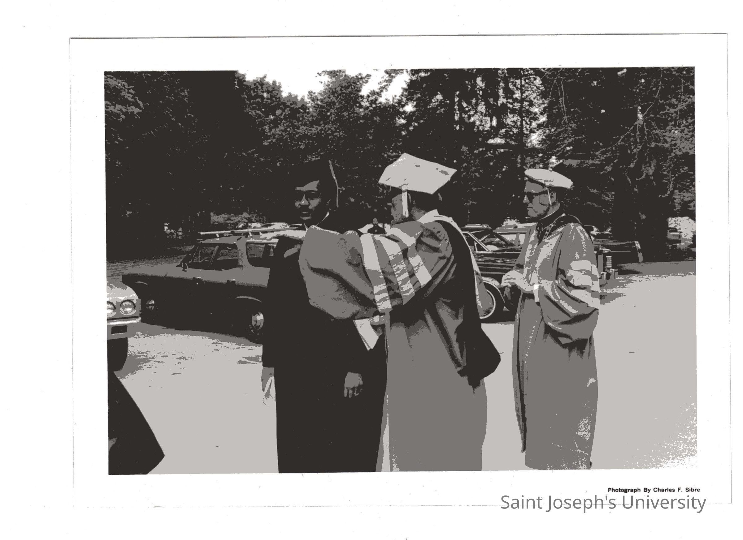 Donald I. MacLean, S.J. and Eugene McCreesh, S.J. (?) welcoming honorary degree recipient U.S. Representative William H. Gray III during 1980 graduation/commencement.