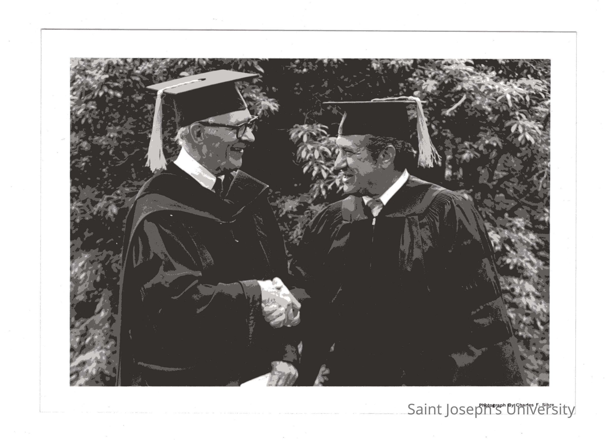 William B. Nixon welcoming honorary degree recipient Joseph J. Saker during 1980 graduation/commencement.