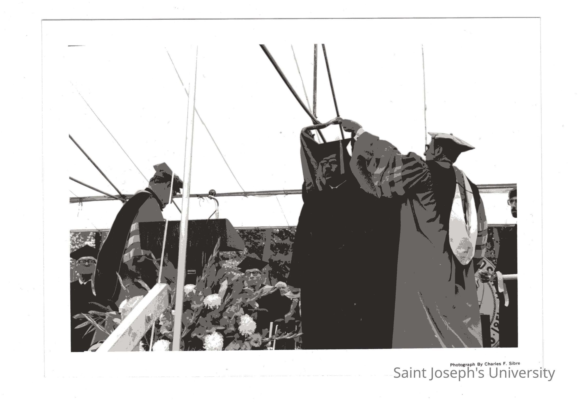 Donald I. MacLean, S.J., conferring honorary degree on U.S. Representative William H. Gray III during 1980 graduation/commencement.