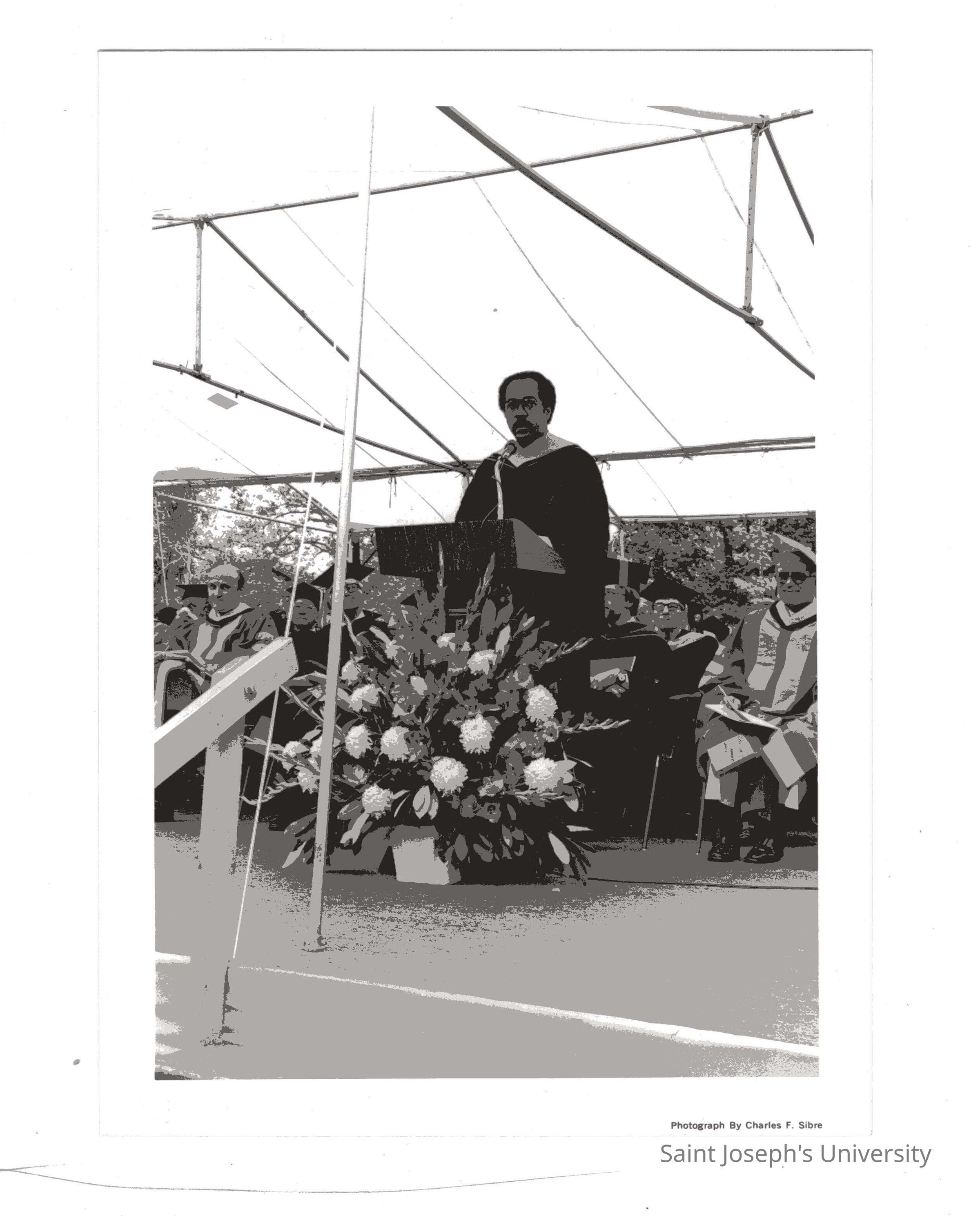 Honorary degree recipient U.S. Representative William H. Gray III addressing graduates during 1980 graduation/commencement.