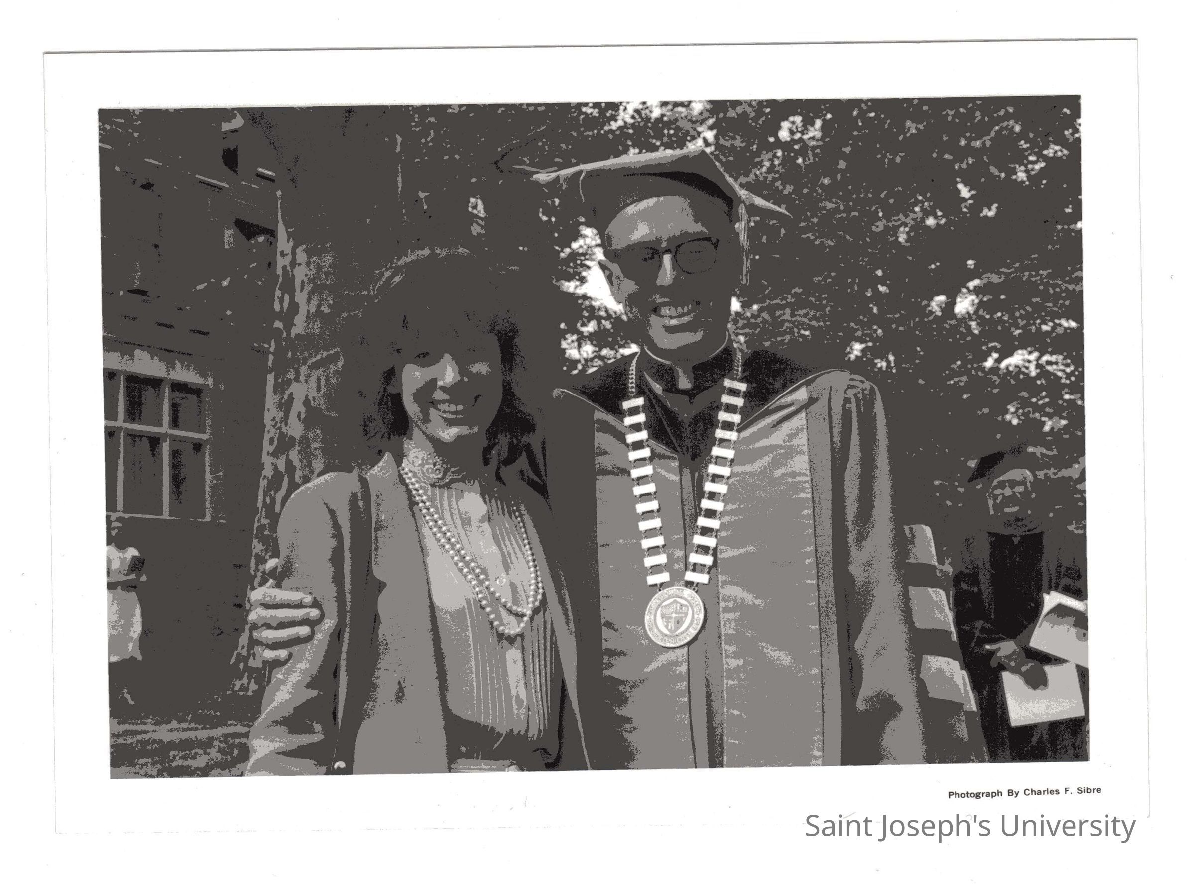 Donald I. MacLean, S.J., with Mary Louise Finlayson duirng 1980 graduation/commencement.