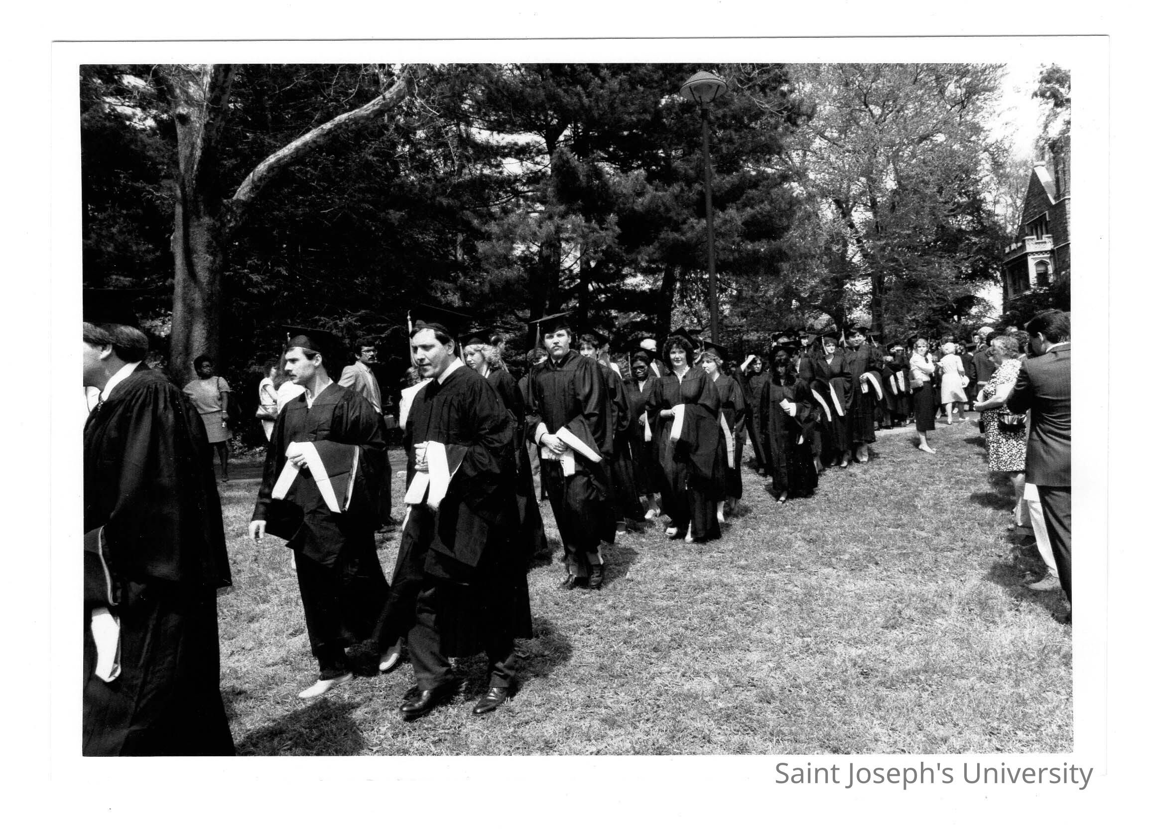 Graduating students processing to Gest Lawn during graduation/commencement, c. 1984.
