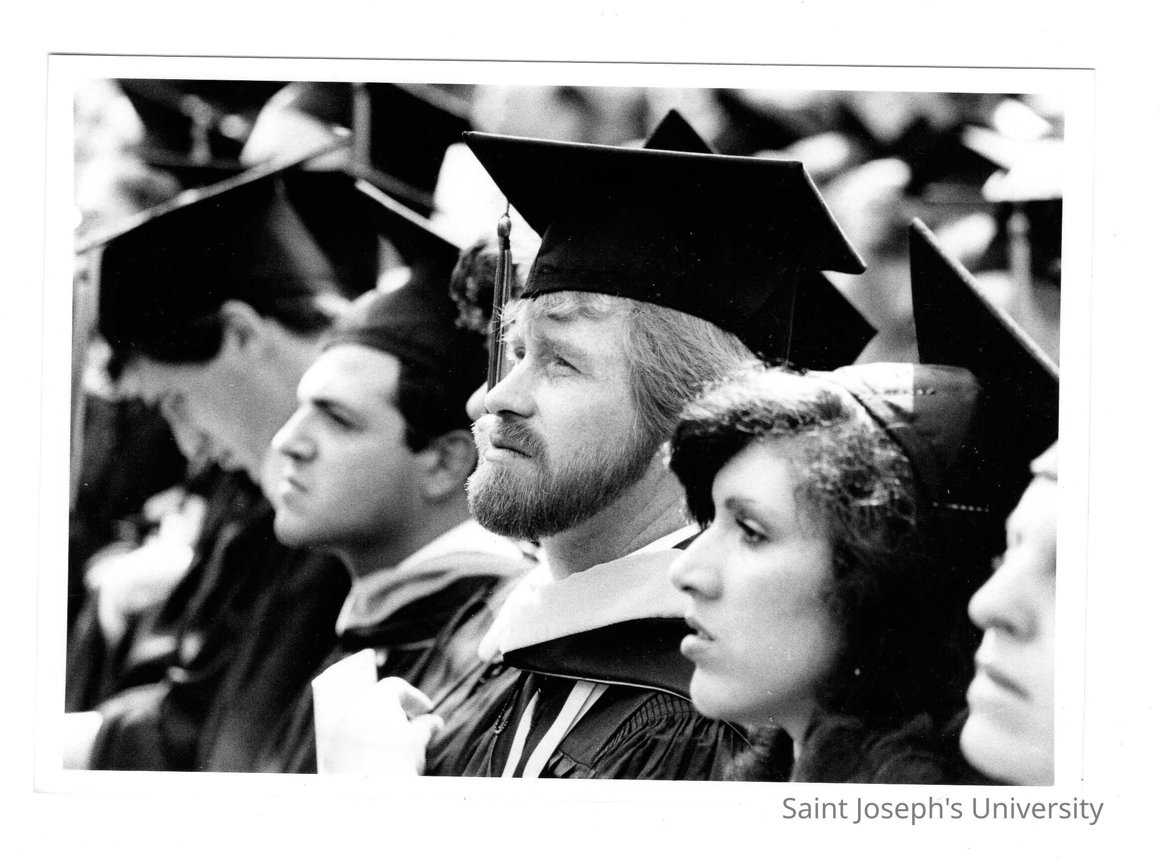 Views of small groups of graduating students during graduation/commencement, c. 1984.