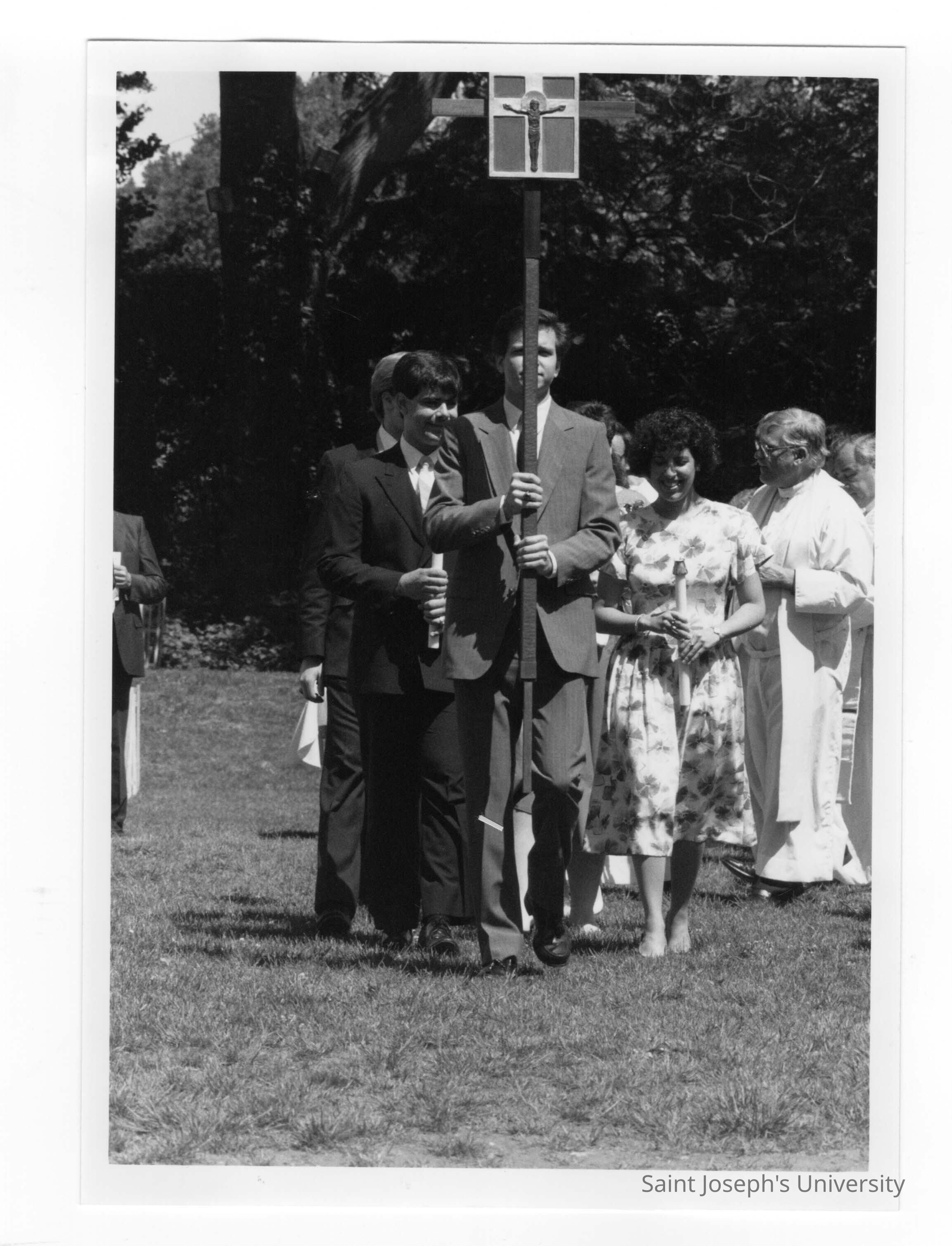 Procession of servers and concelebrants during Baccalaureate service, 1985 graduation/commencement. Also a photograph of program.