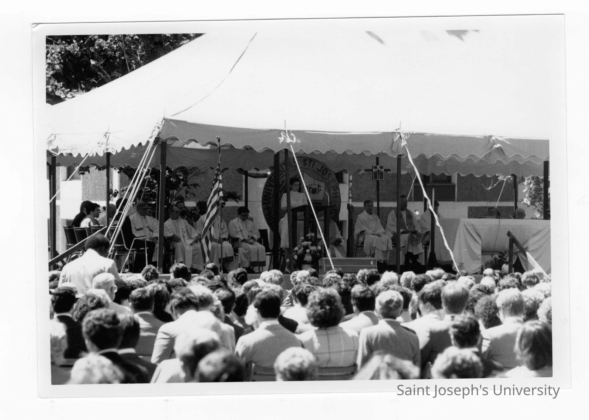 View of student speaker during outdoor Baccalaureate service, graduation/commencement, c. 1985.