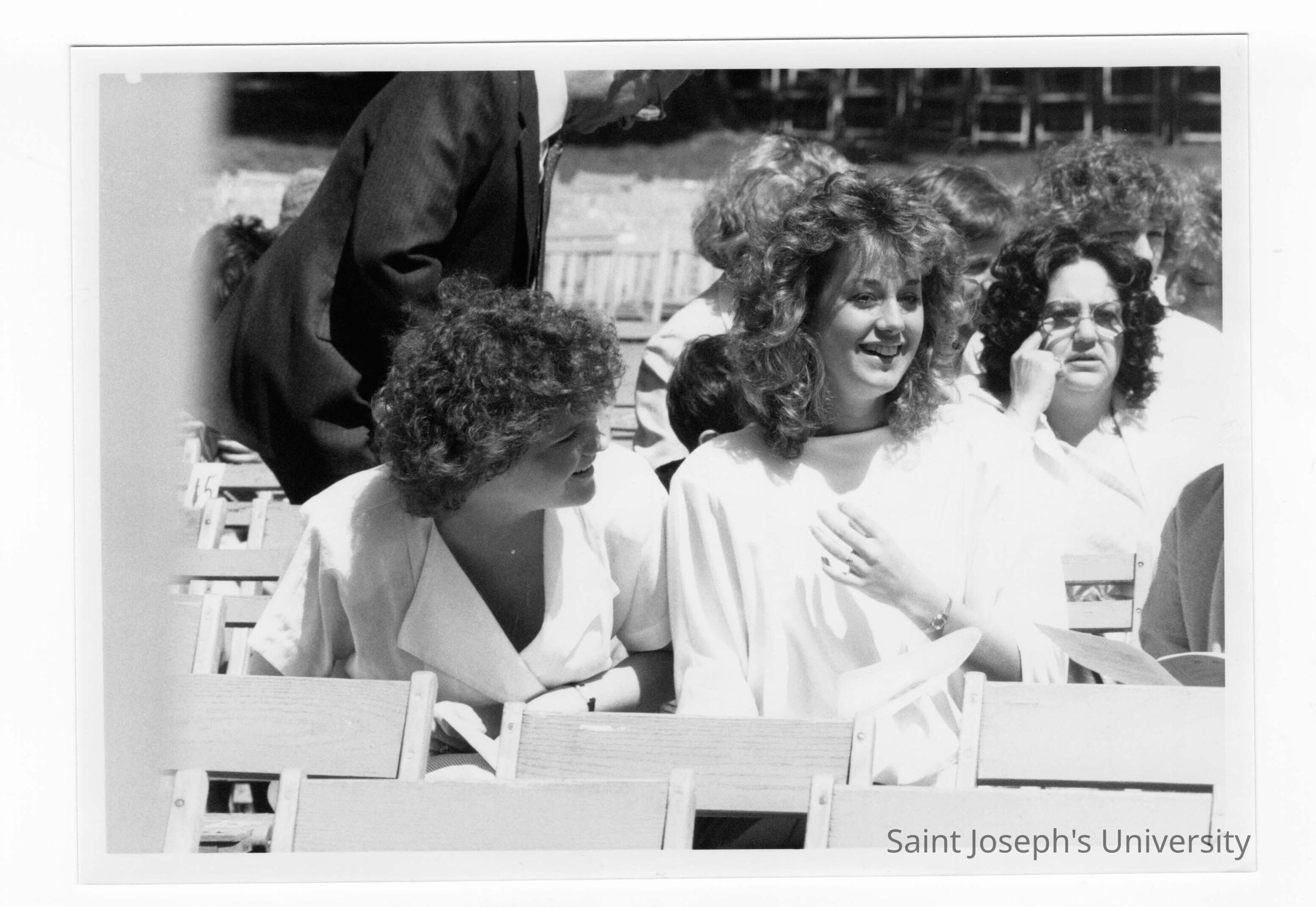 Views of students and guests at outdoor Baccalaureate service, graduation/commencement, c. 1985.