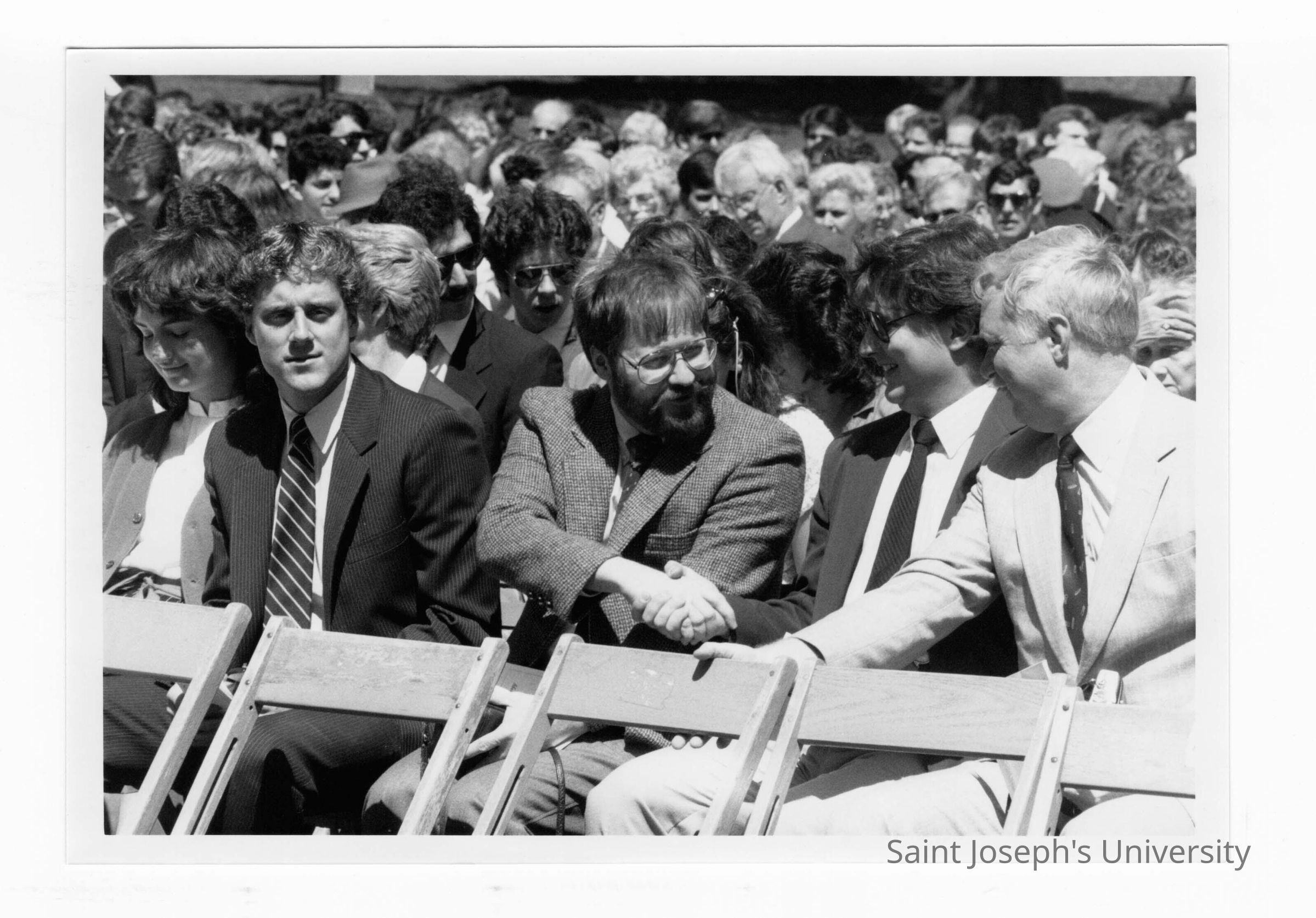 View of faculty, students, and guests at outdoor Baccalaureate service during graduation/commencement, c. 1985. Joseph Gower (?) included in photograph.