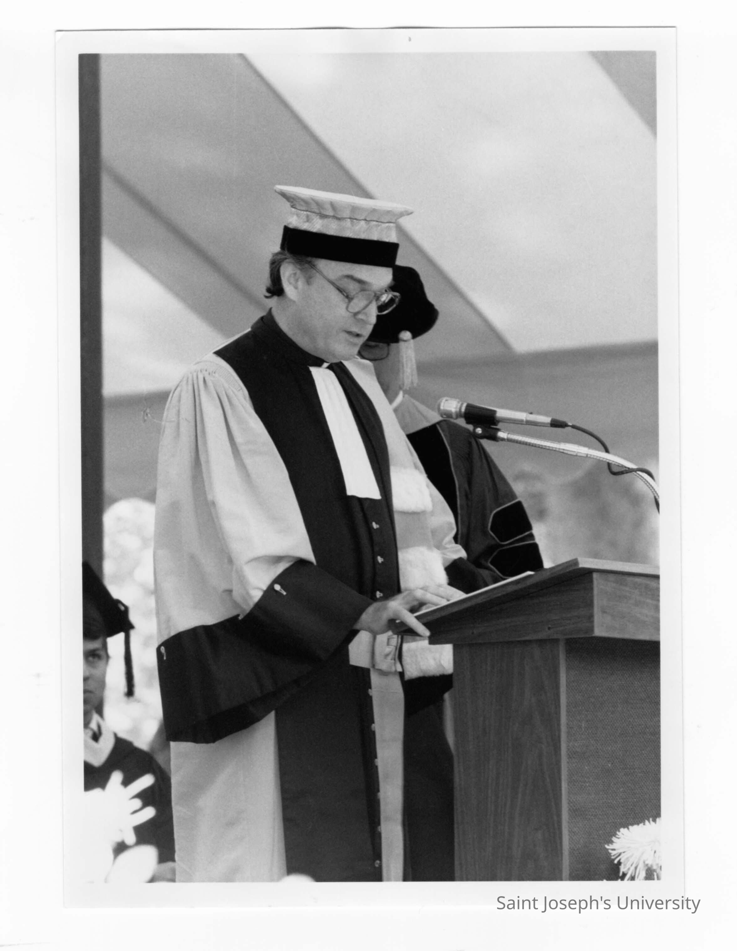 Francis F. Burch, S.J., reading honorary degree citation to Michael J. Smith, S.J. during 1985 graduation/commencement.