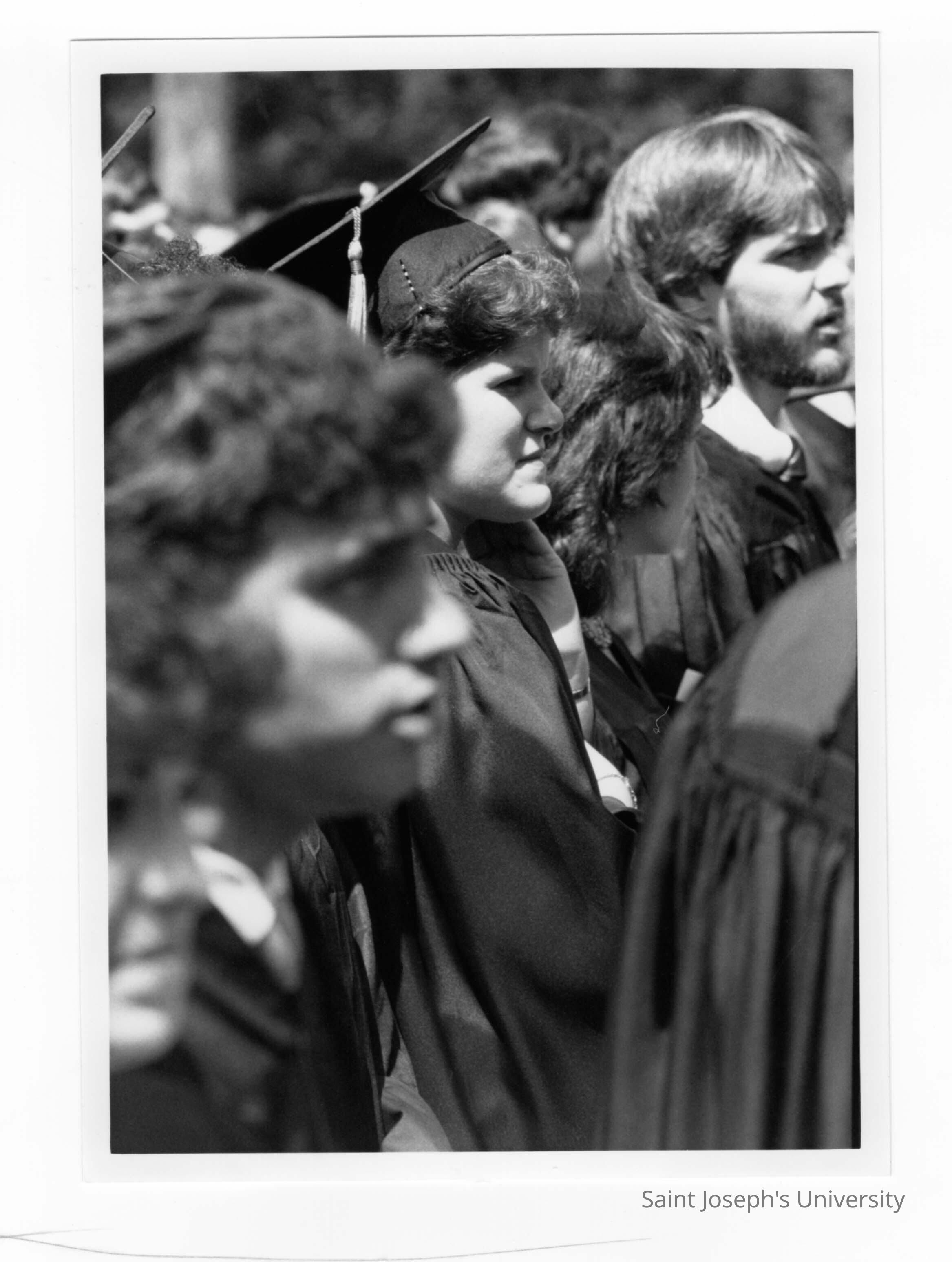 Views of small groups of students during 1985 graduation/commencement on Gest Lawn.
