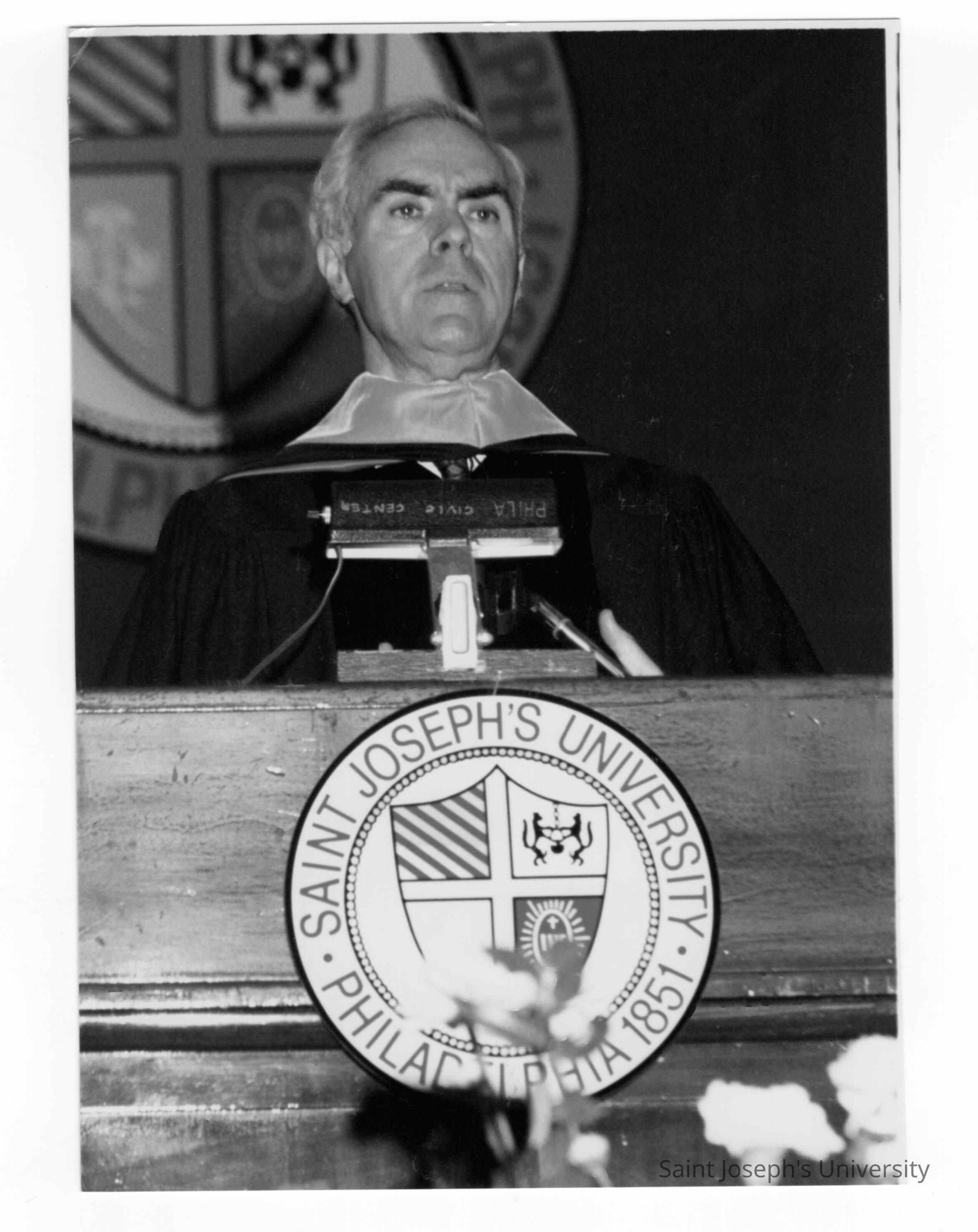 Honorary degree recipient, Robert P. Casey, addressing graduates during 1989 graduation/commencement at Convention Hall, Philadelphia Civic Center.