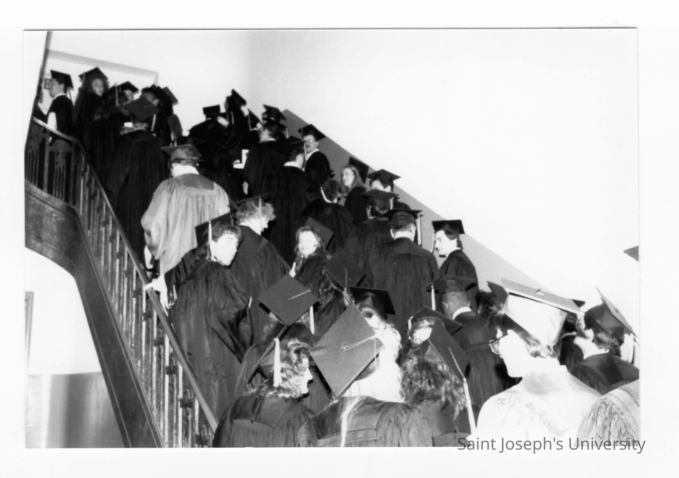Graduating students climbing stairwell to Convention Hall, Philadelphia Civic Center during 1990 graduation/commencement.