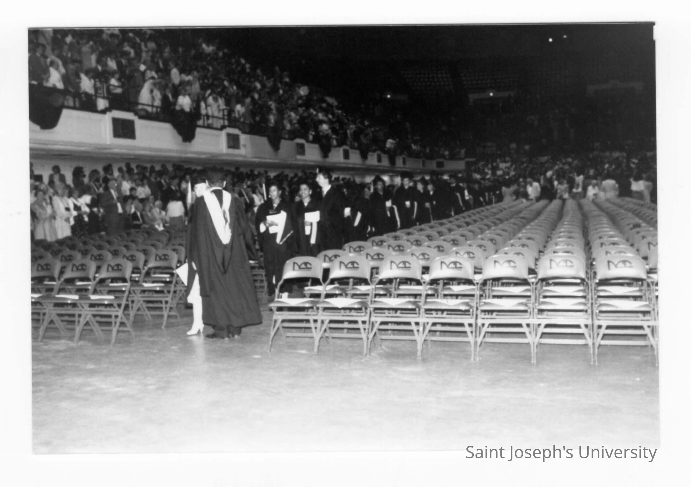 Graduates processing into Convention Hall, Philadelphia Civic Center during 1990 graduation/commencement.