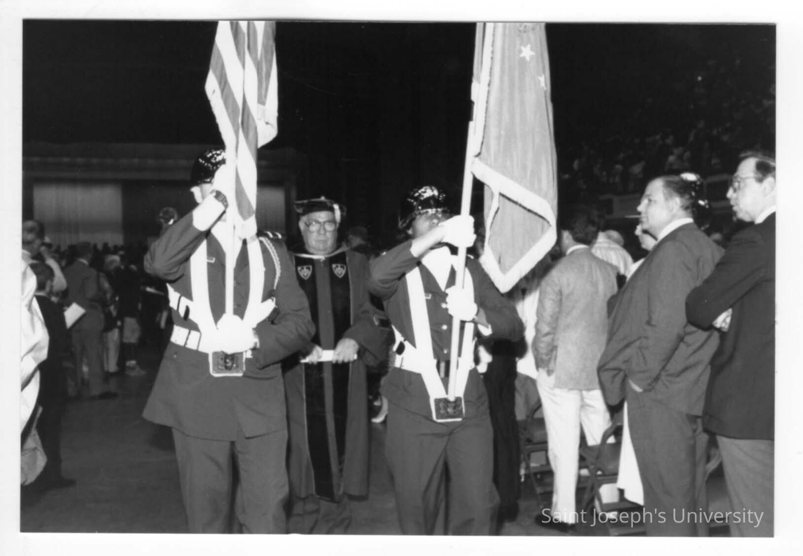 Color guard leading Nicholas S. Rashford, S.J., and others in recessional during 1990 graduation/commencement.