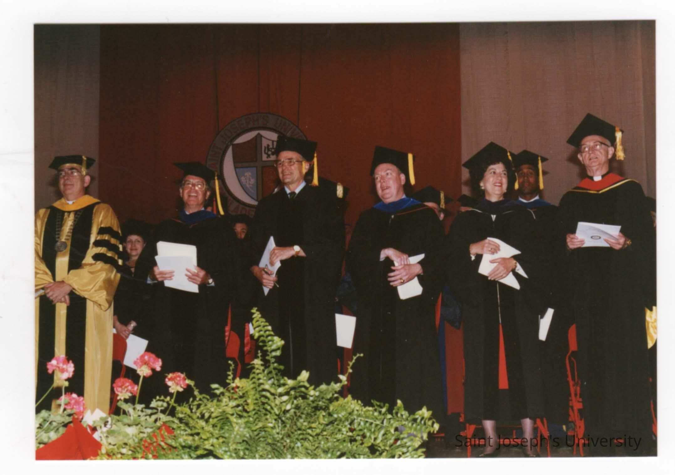 View of Nicholas S. Rashford, S.J., faculty members, and honorary degree recipients on stage during 1990 graduation/commencement.