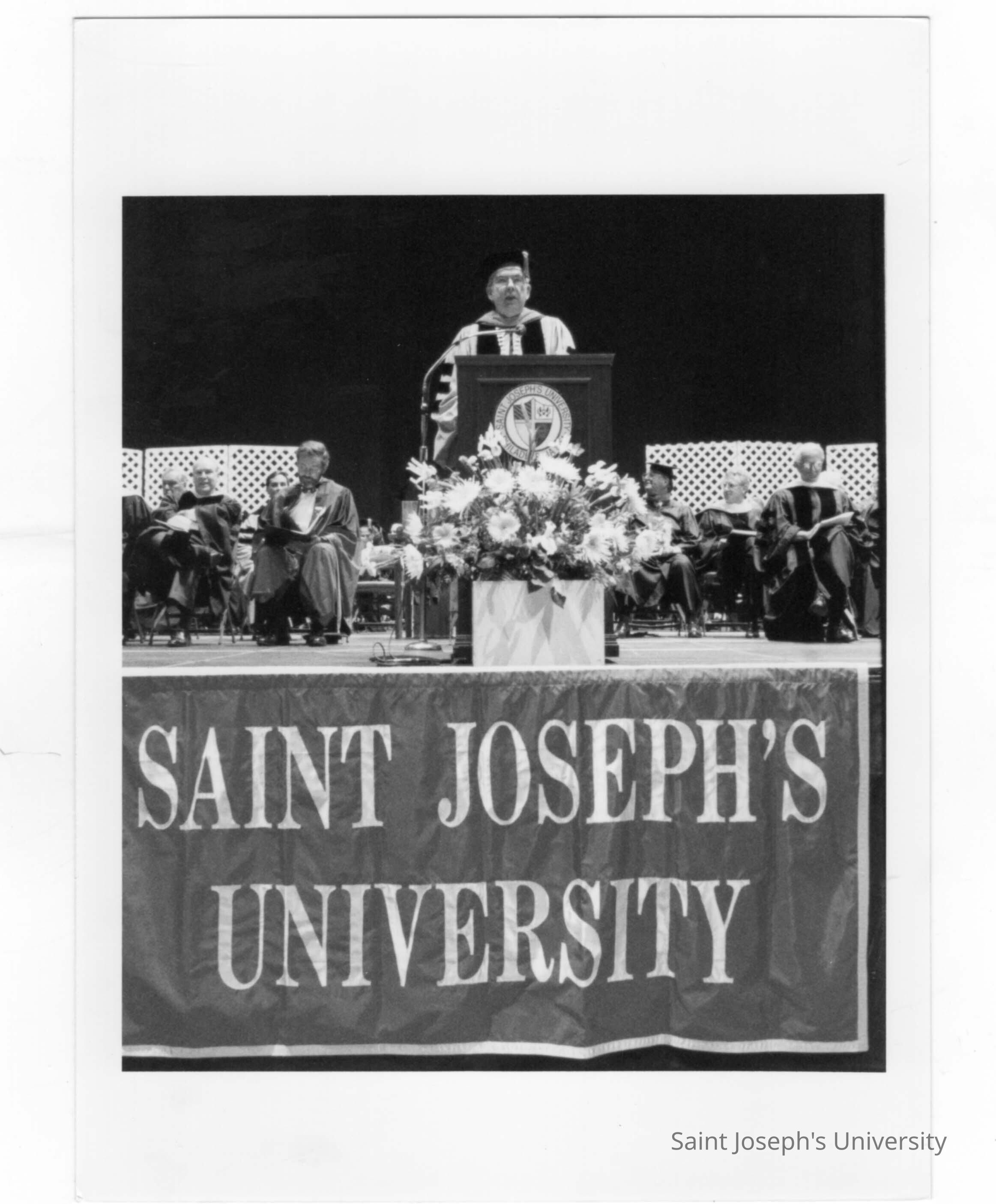 Nicholas S. Rashford, S.J., addressing during 1991 graduation/commencement in Convention Hall in Philadelphia Civic Center.