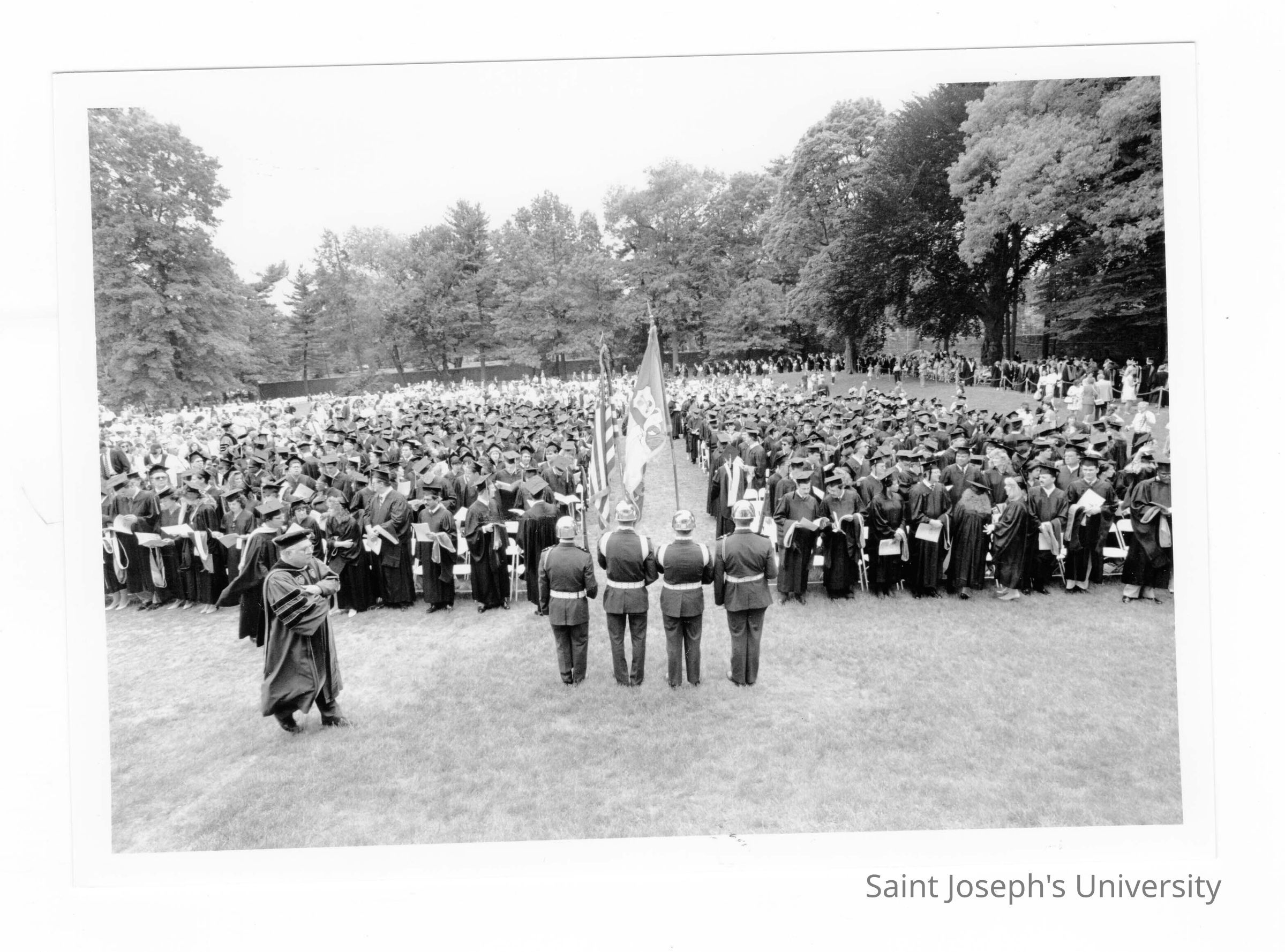 View of graduating students and color guard on Gest Lawn during 1993 graduation/commencement.