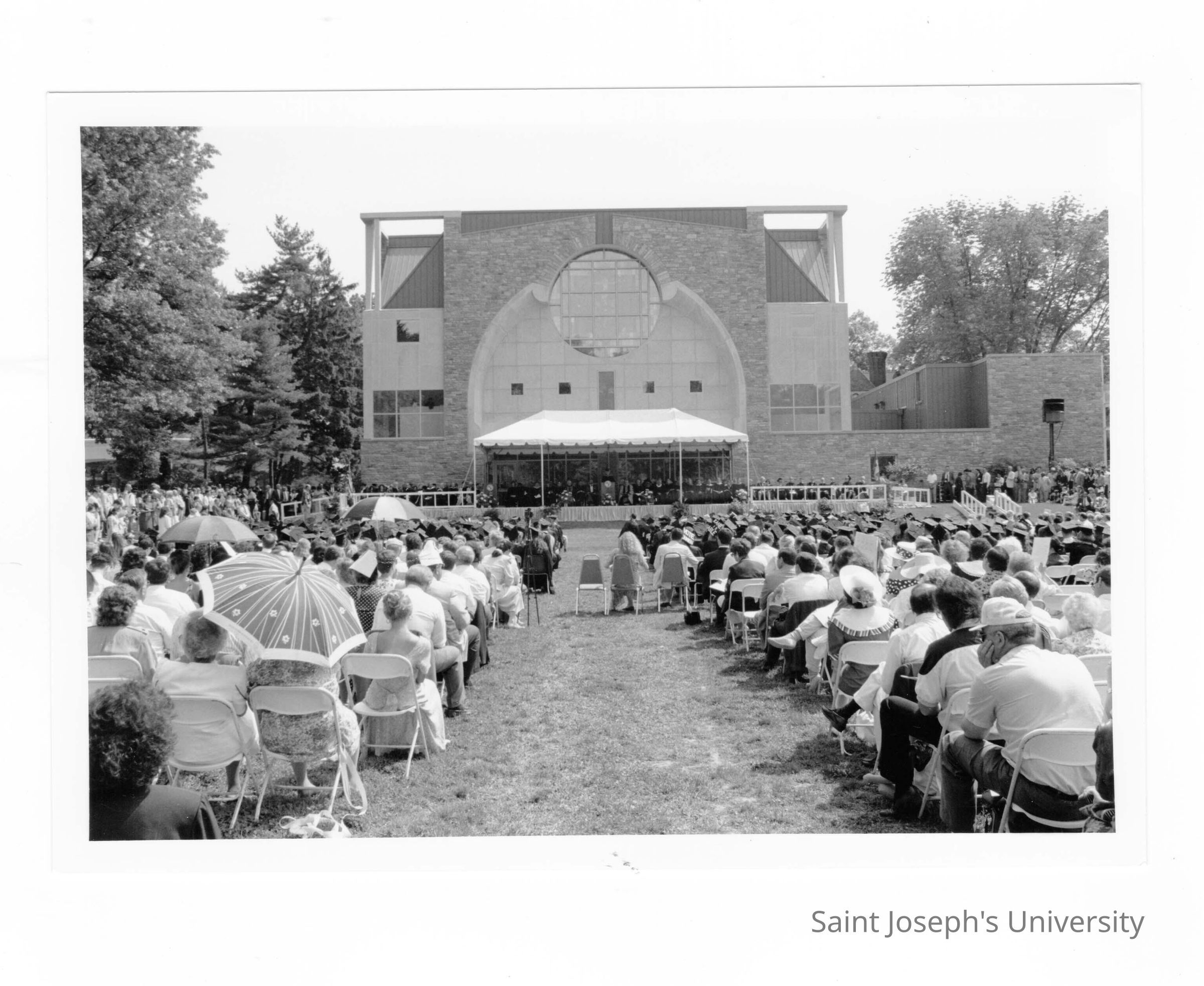 View of 1993 graduation/commencement ceremony on Gest Lawn with chapel in background.