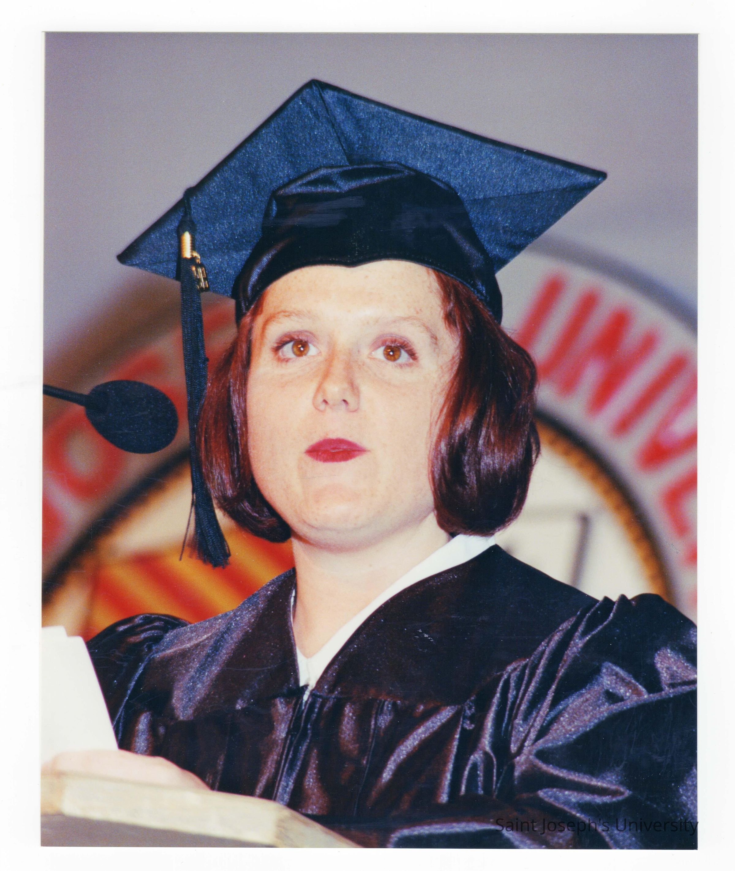 Graduate student, possibly Shana Maier, addressing audience during 1999 graduation/commencement.