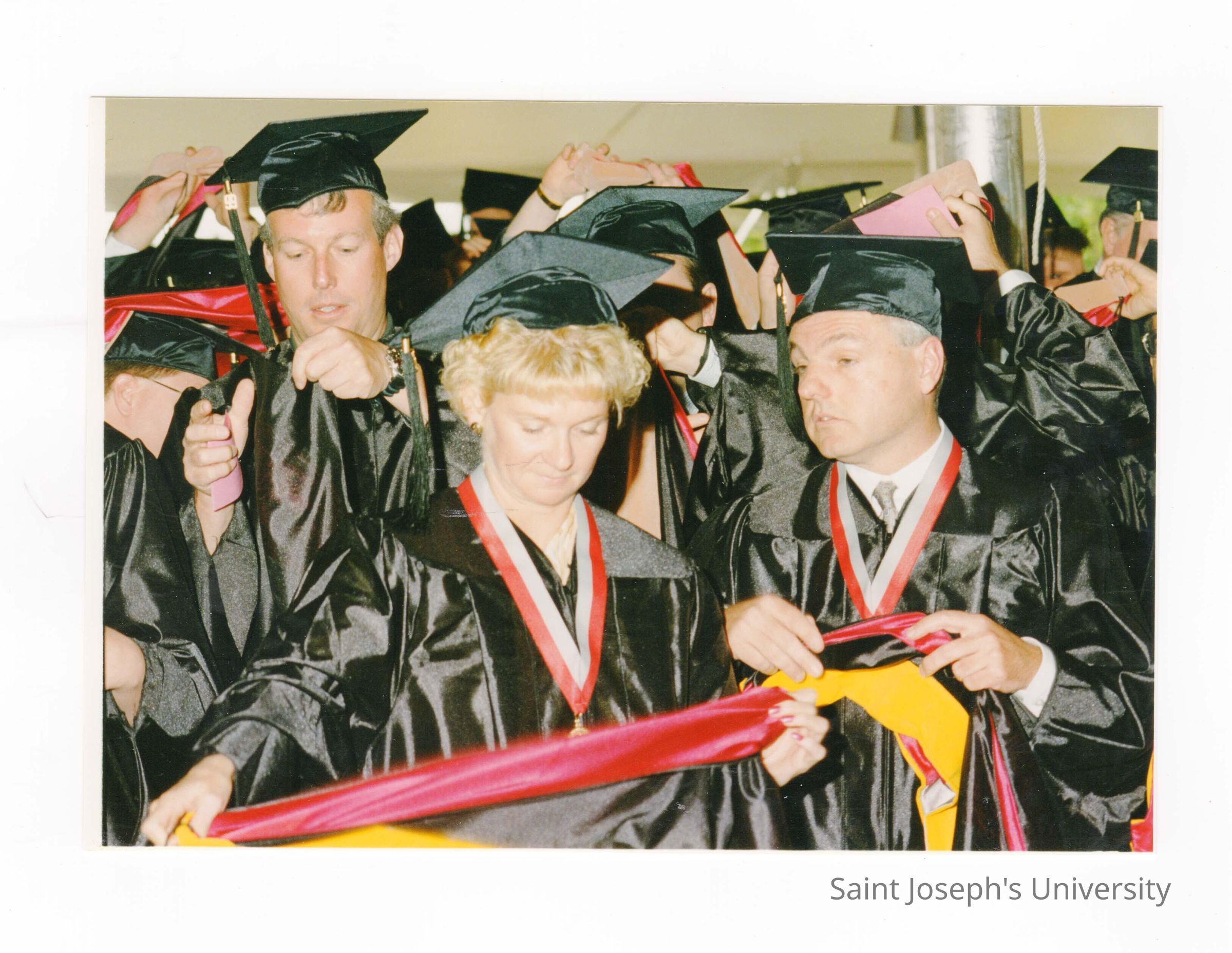 Masters degree students donning hoods during 1999 graduation/commencement.