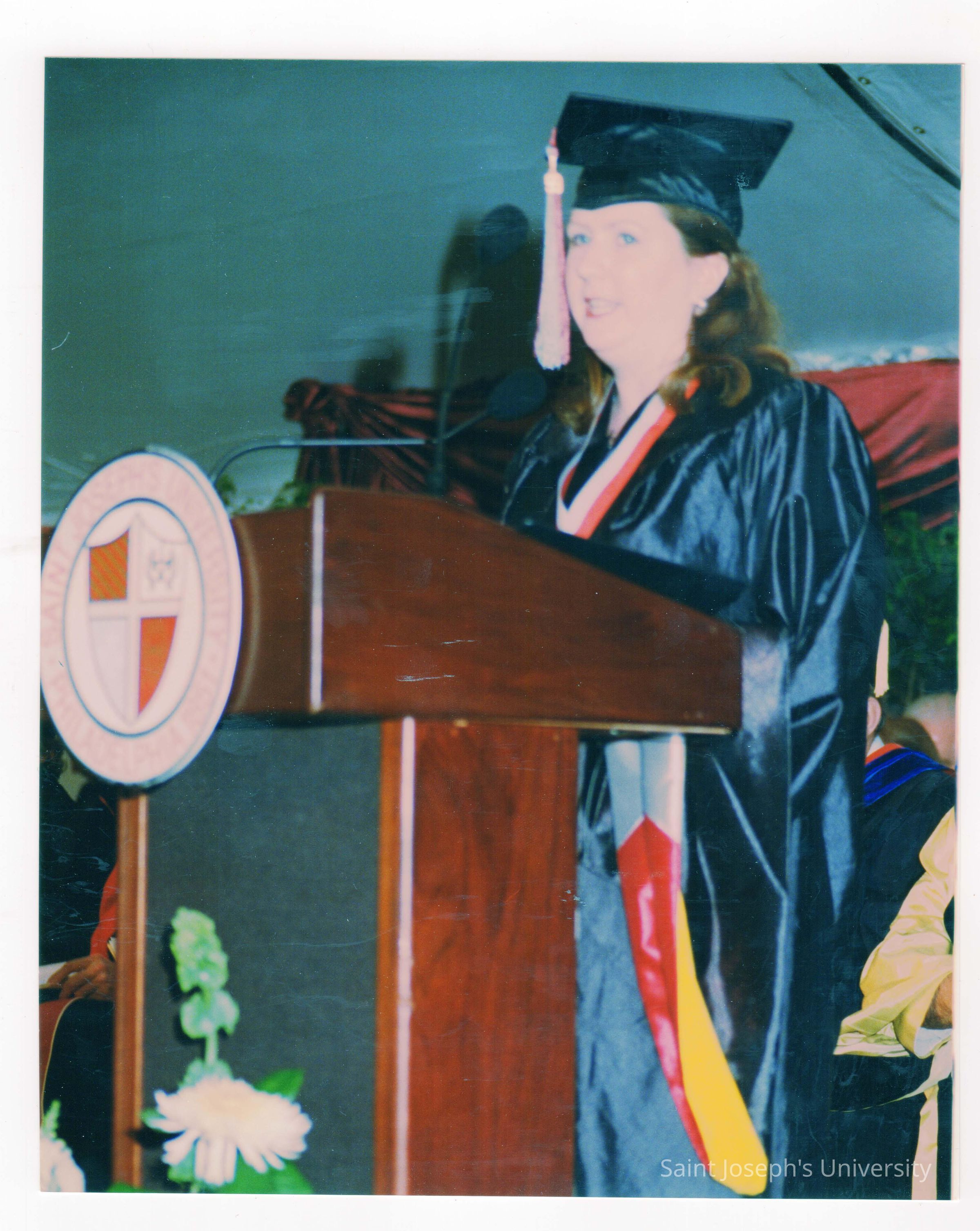 Graduating student, possibly Theresa McGinnis (?), addressing audience during 1999 graduation/commencement.