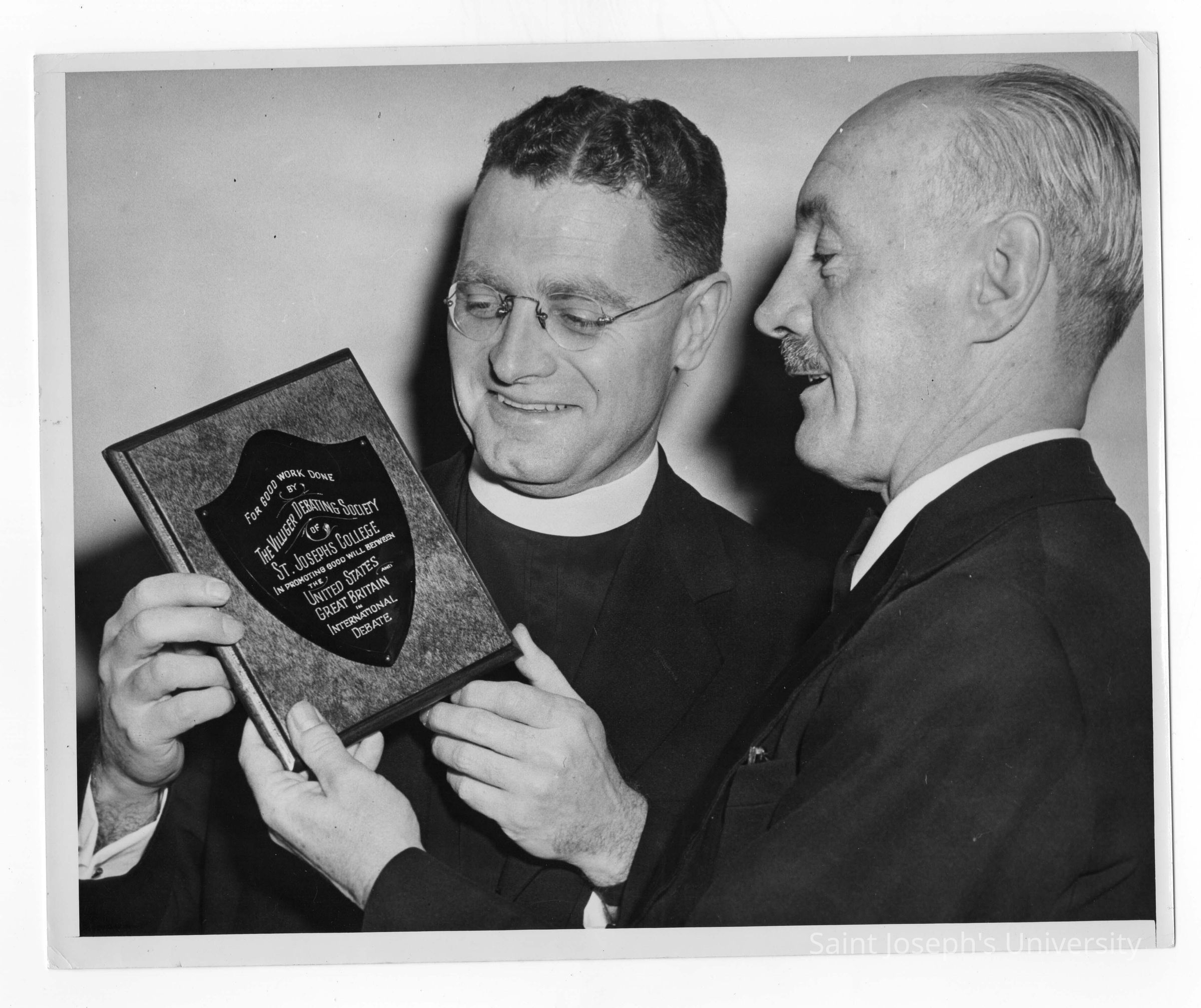 Edward G. Jacklin, S.J. holding trophy won by Villiger Debating team in international debate with Oxford.