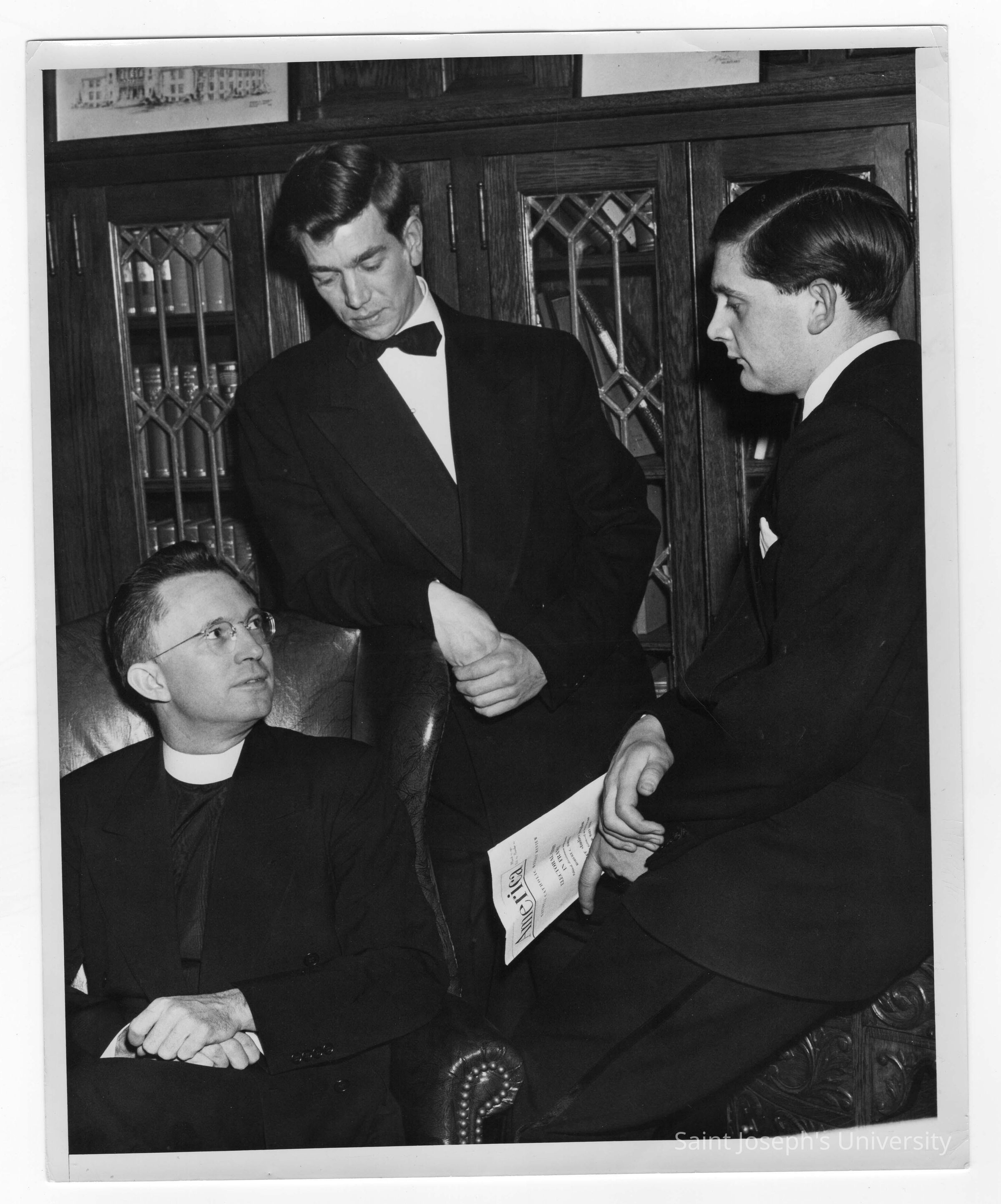 Matthew G. Sullivan, S.J. and two members of Villiger Debating team at during debate with Oxford.