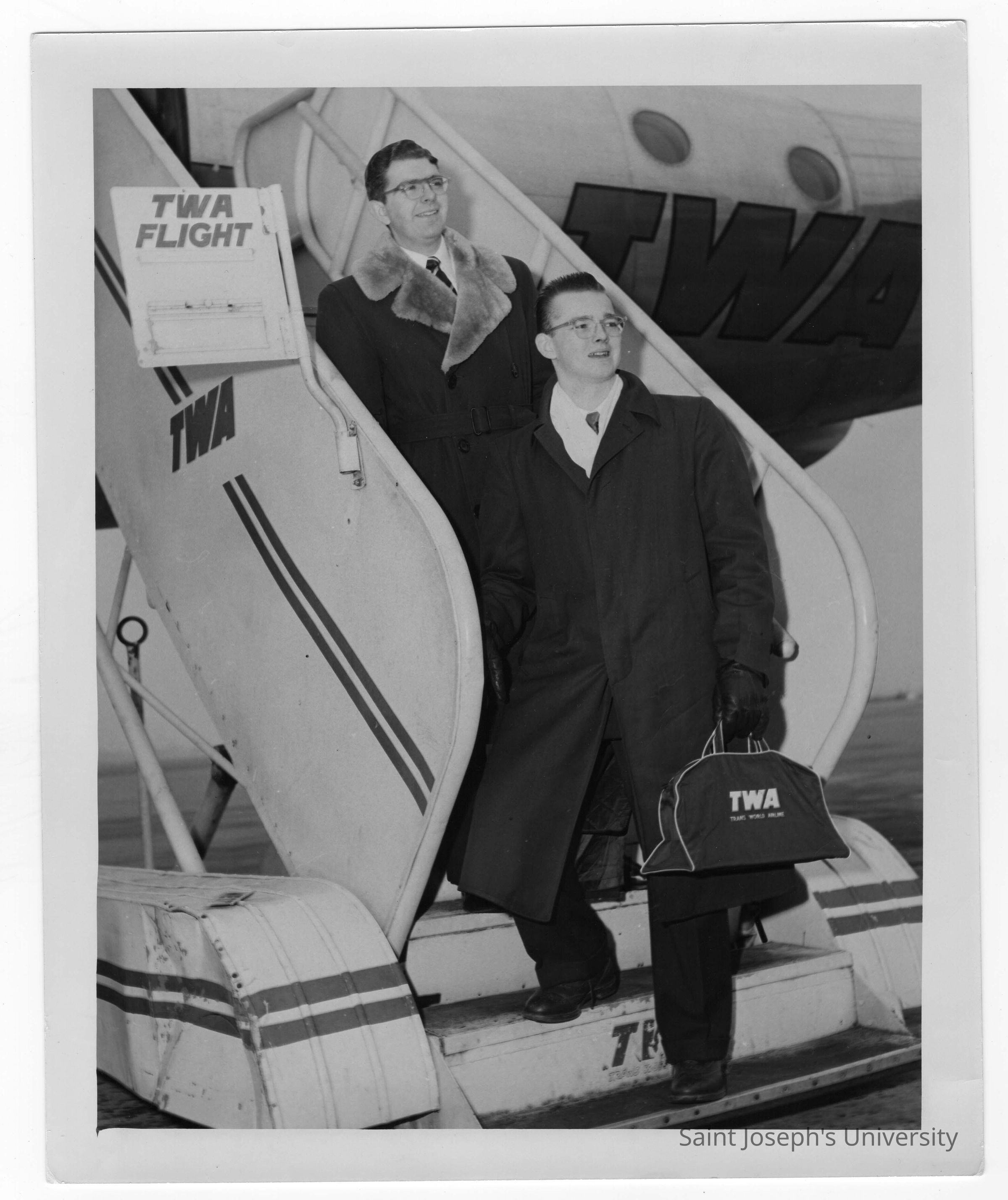 Two members of Villiger Debating Society, Joseph T. English and Frederick W. Floyd, boarding plane for debates in Ireland and England.