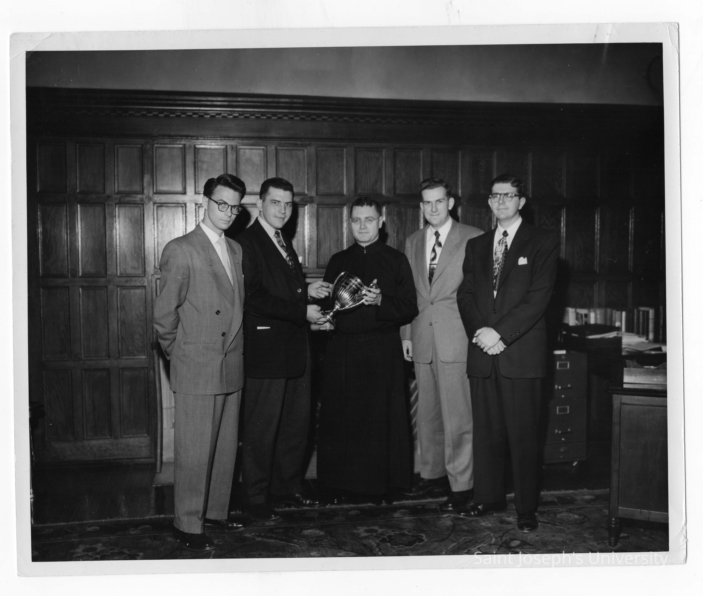 Student members of Villiger Debating Society giving trophy to Edward G. Jacklin, S.J. Students include F. Emmett Fitzpatrick, Thomas Shea, Francis J. Hartman, and Joseph English.