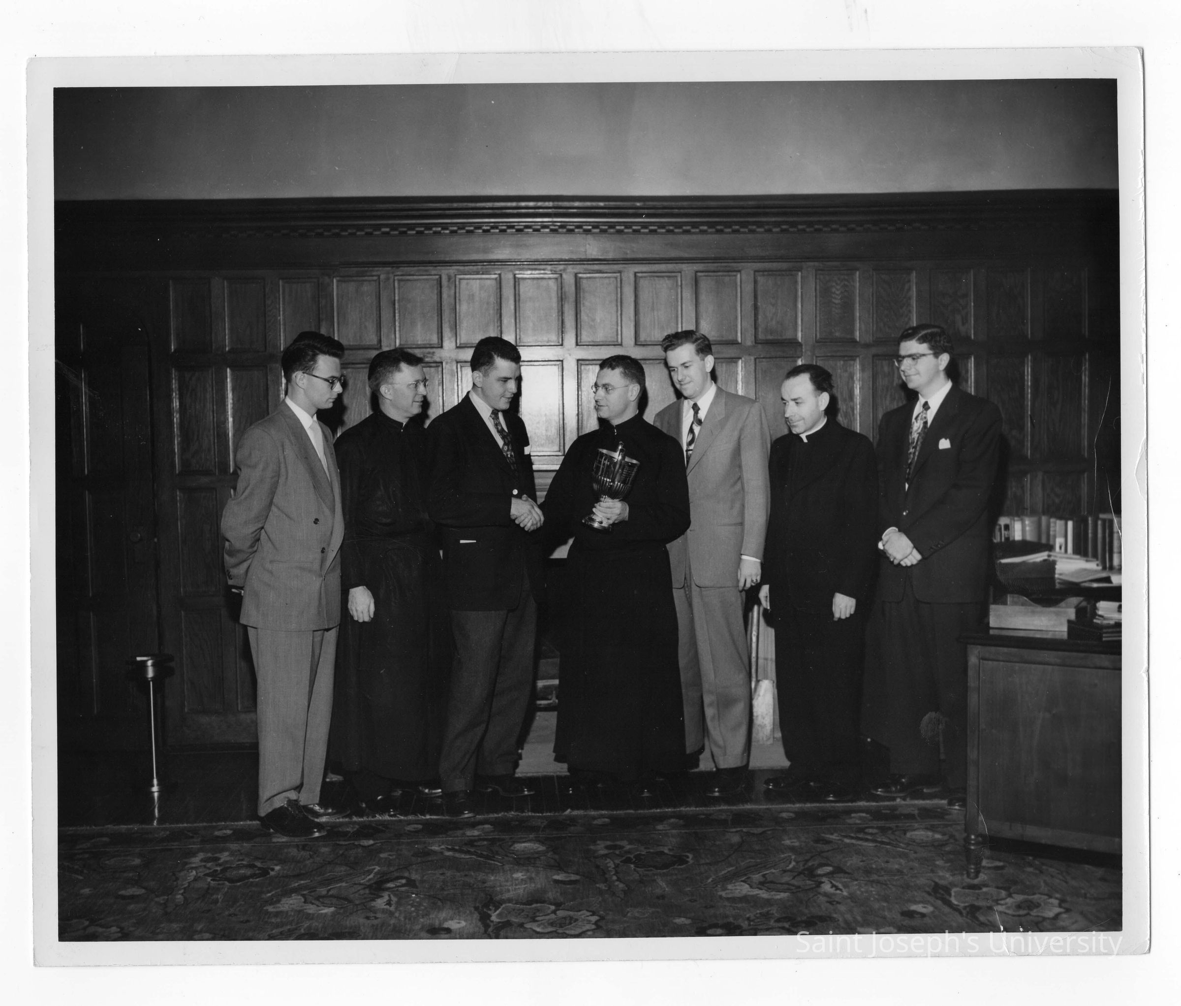 Student members of Villiger Debating Society, Matthew G. Sullivan, S.J., and Father Gibbons presenting trophy to Edward G. Jacklin, S.J., president of Saint Joseph's College.
