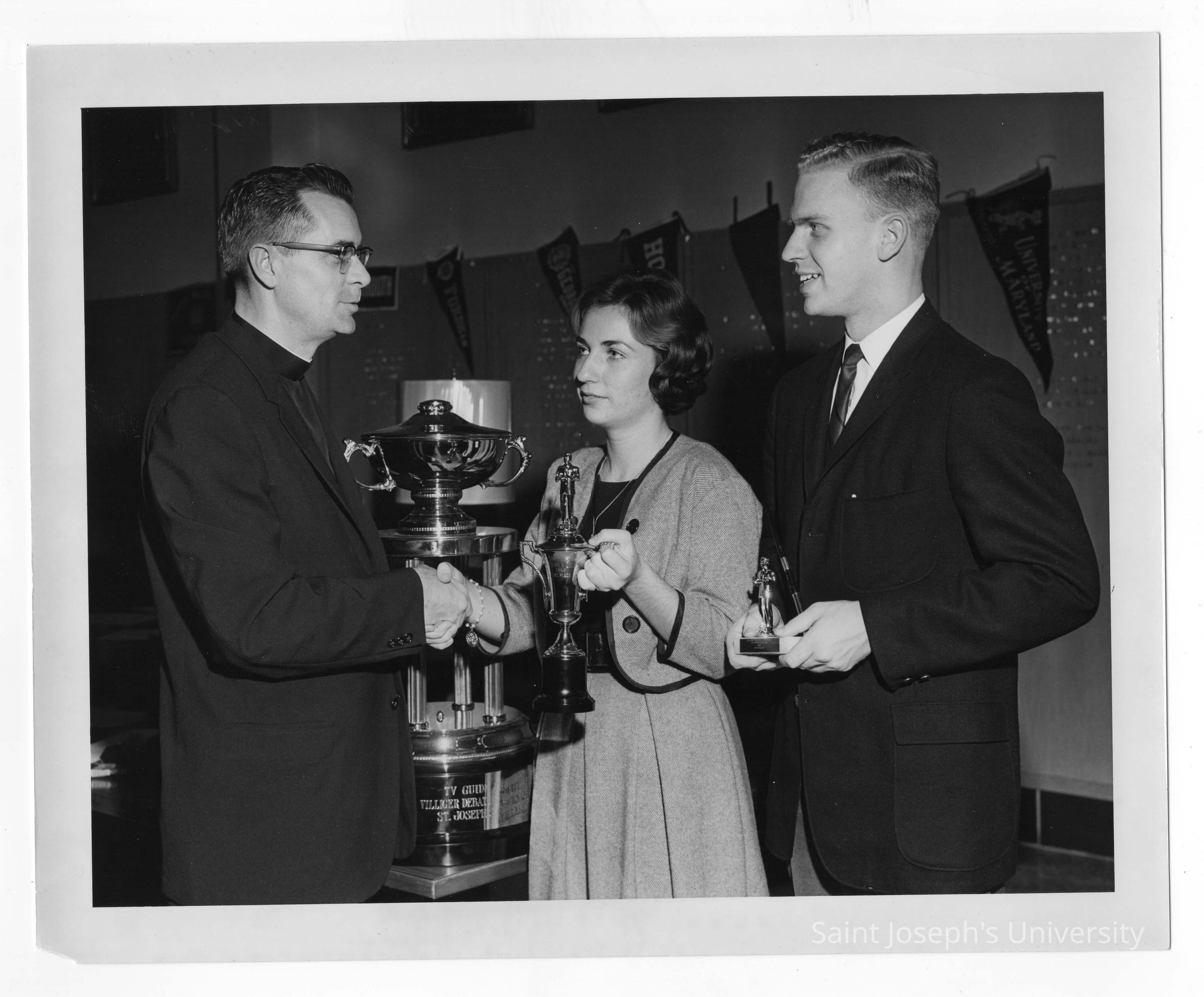Student from Villiger Debating Society and woman presenting trophies to Jesuit (?) with TV Guide trophy in background.