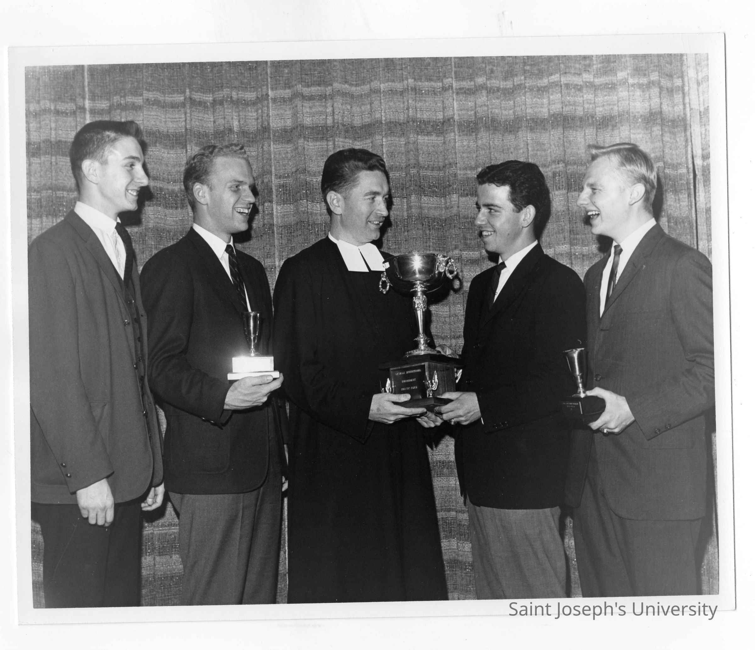 Students from Villiger Debating team, John Jenemann, Dennis Suplee, Louis Hoelzle, Davide Drueding, receiving trophy from Dr. Robert P. Newman.