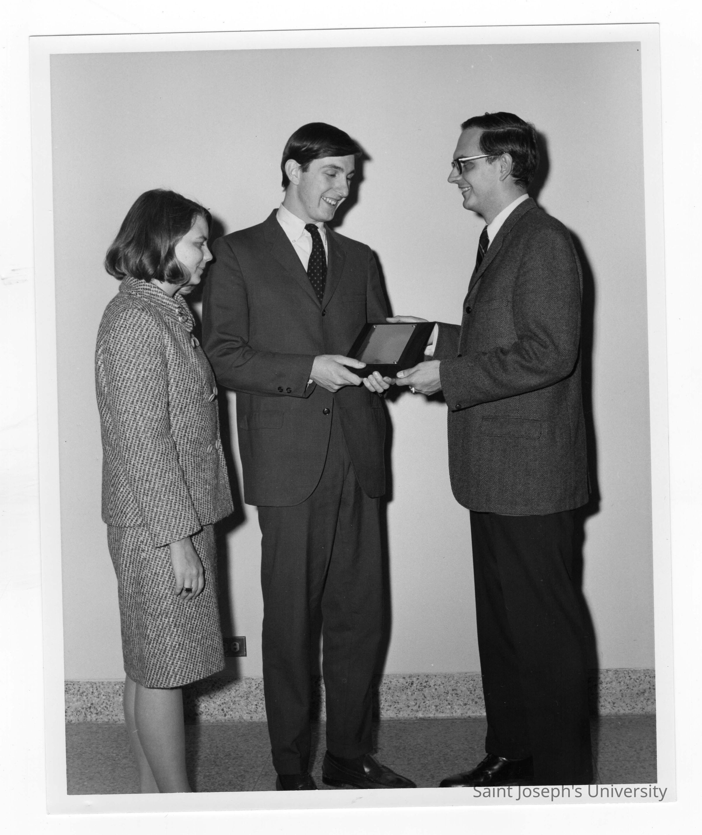 Student from Villiger Debating Society, Wayne Barrett, receiving award from Rosemont College Debate coach Thomas Miller while Sheila Williams, Rosemont College Debate Tournament chairman looks on.