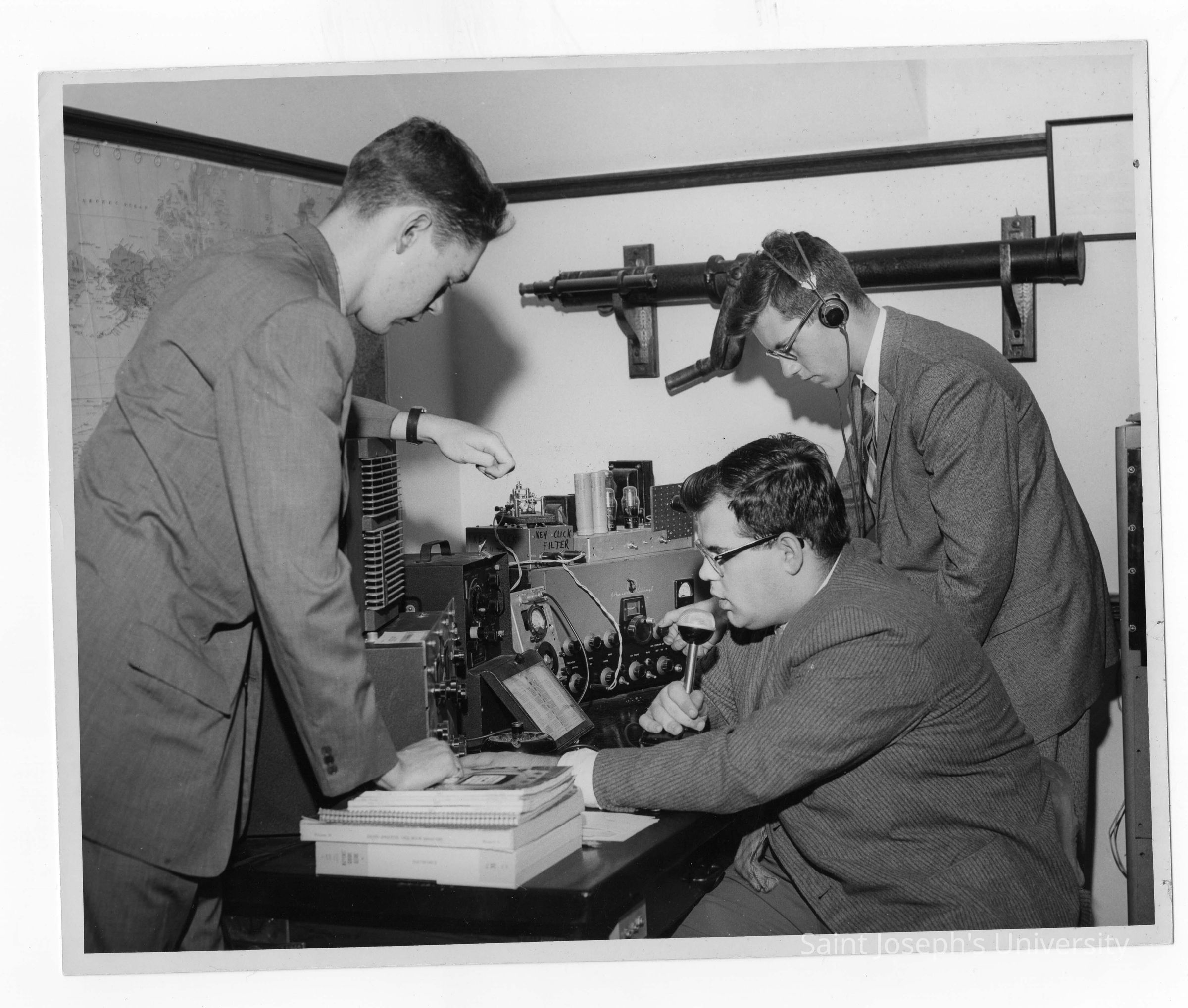 Three members of student Radio Club working with equipment and speaking into microphone. (Connected to Physics Department?)