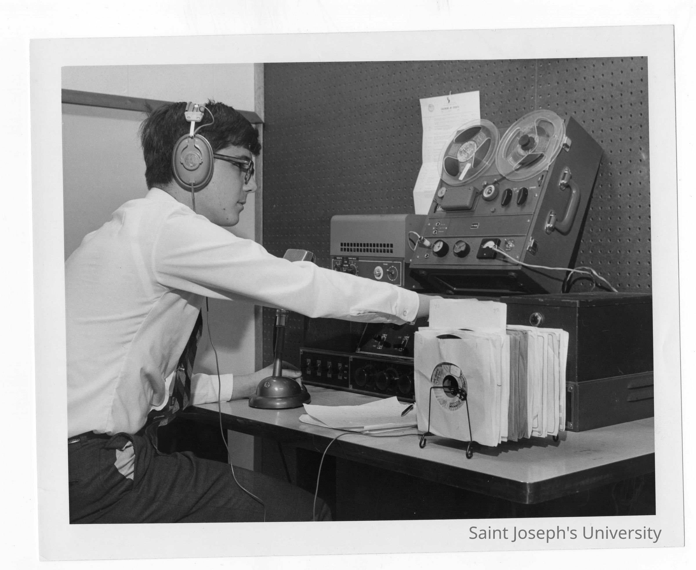 Student in Radio Club (Station WSJR?) sitting at table with microphone tape recorder, tape player, and forty-five rpm records.