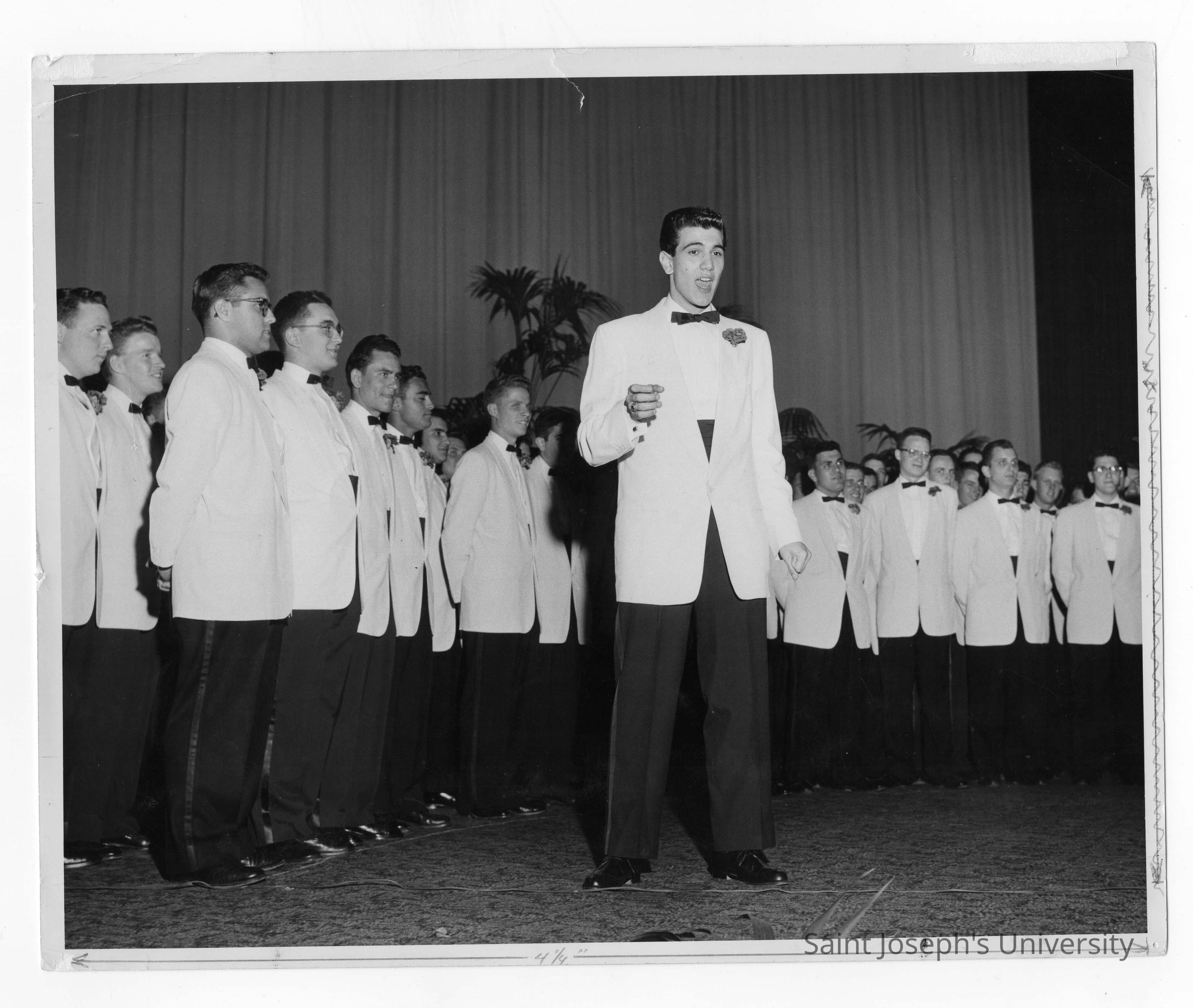 Members of Glee Club wearing white tuxedos giving concert in Flanigan Auditorium.