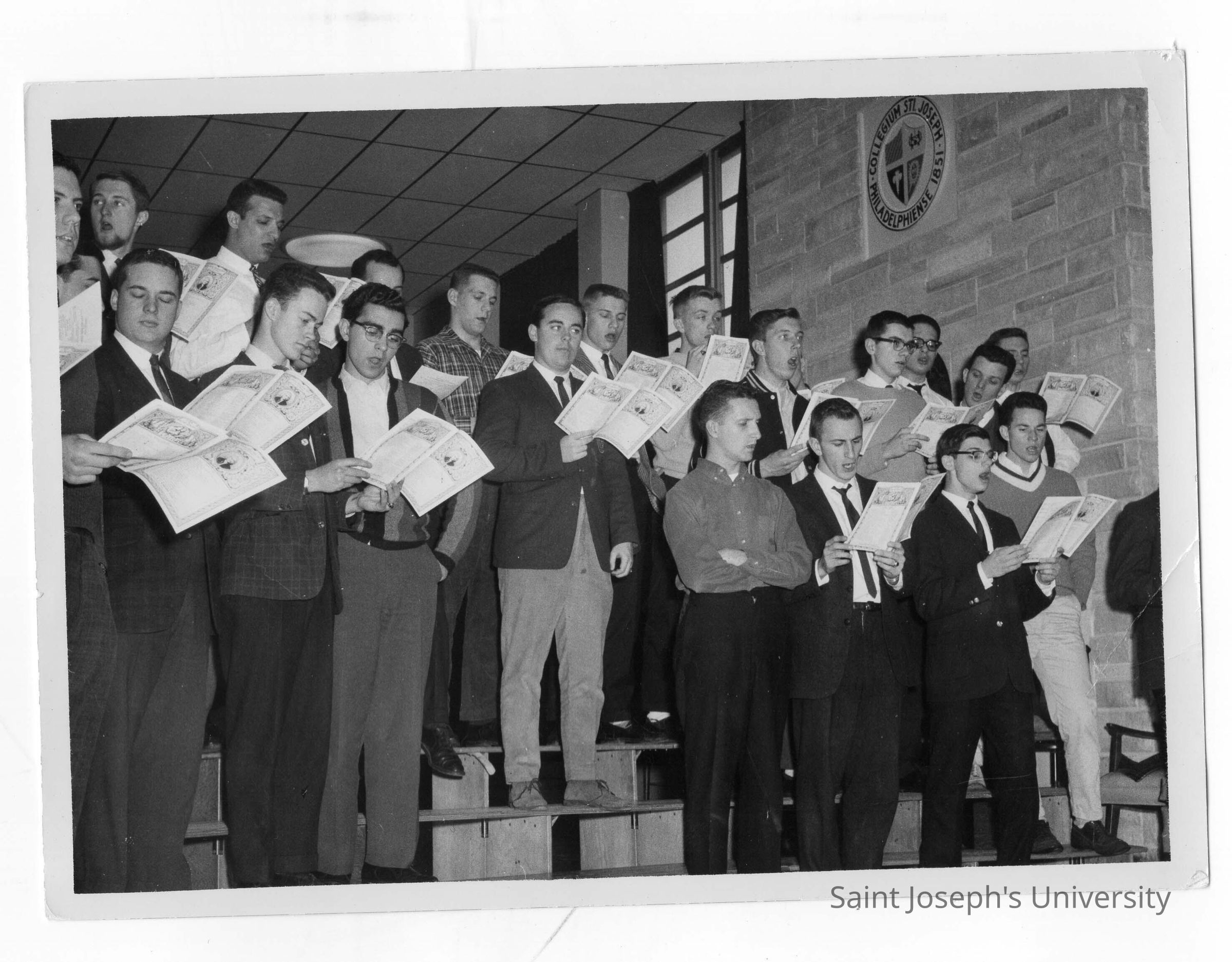 Students in Glee Club practicing in street clothes and holding sheet music.