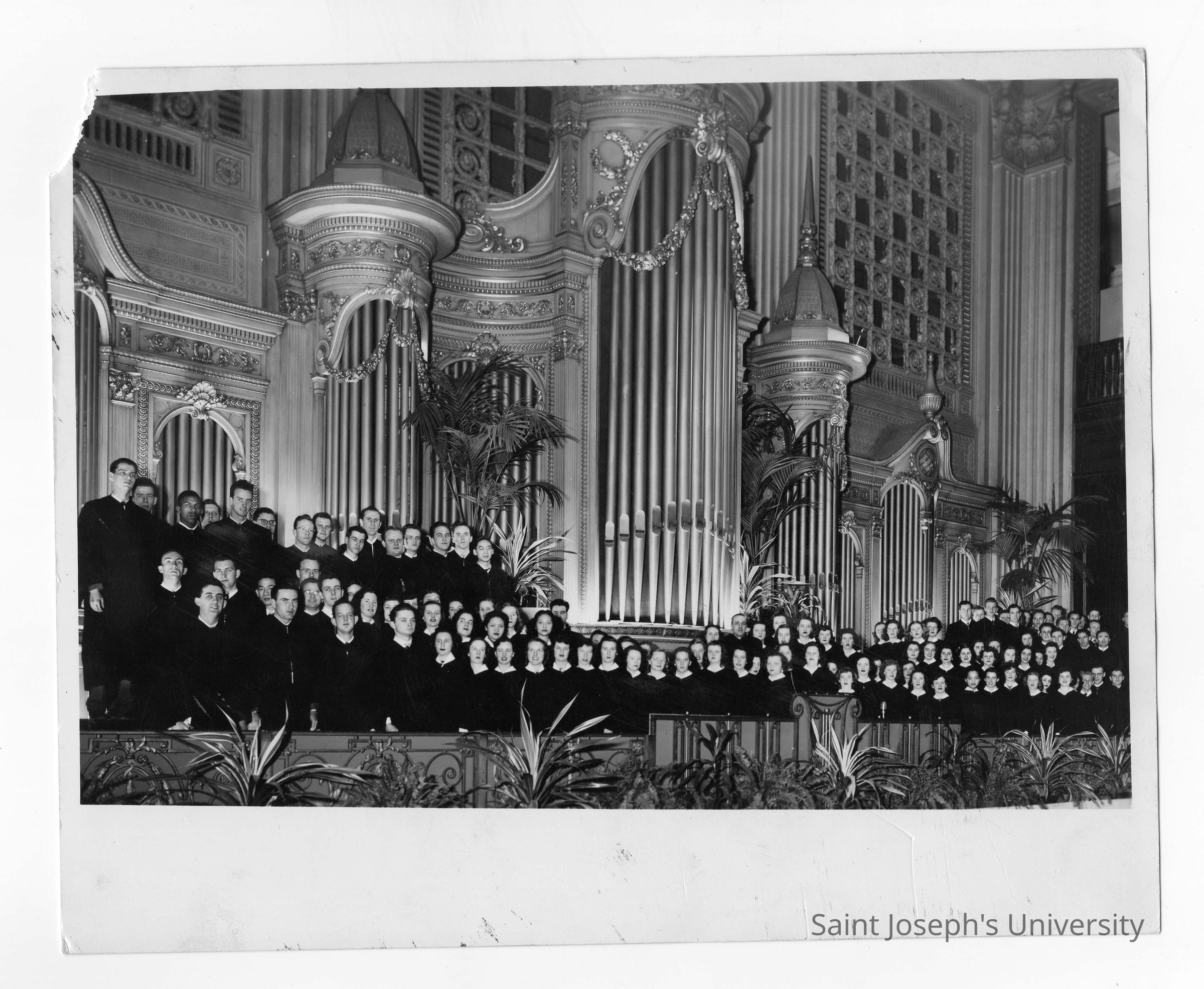 Saint Joseph's College Glee Club and Immaculata College Glee Club giving joint performance at John Wanamaker Department Store in center city Philadelphia.